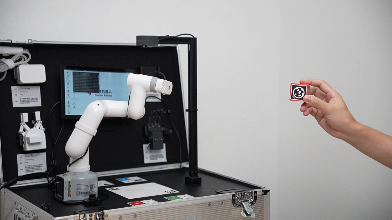 按下数字0,启动stag码跟踪案例功能。首先机械臂会运动到观测点初始位置,然后Stag码木块与机械臂末端摄像头法兰保持30cm距离,机械臂开始进行跟踪运动。