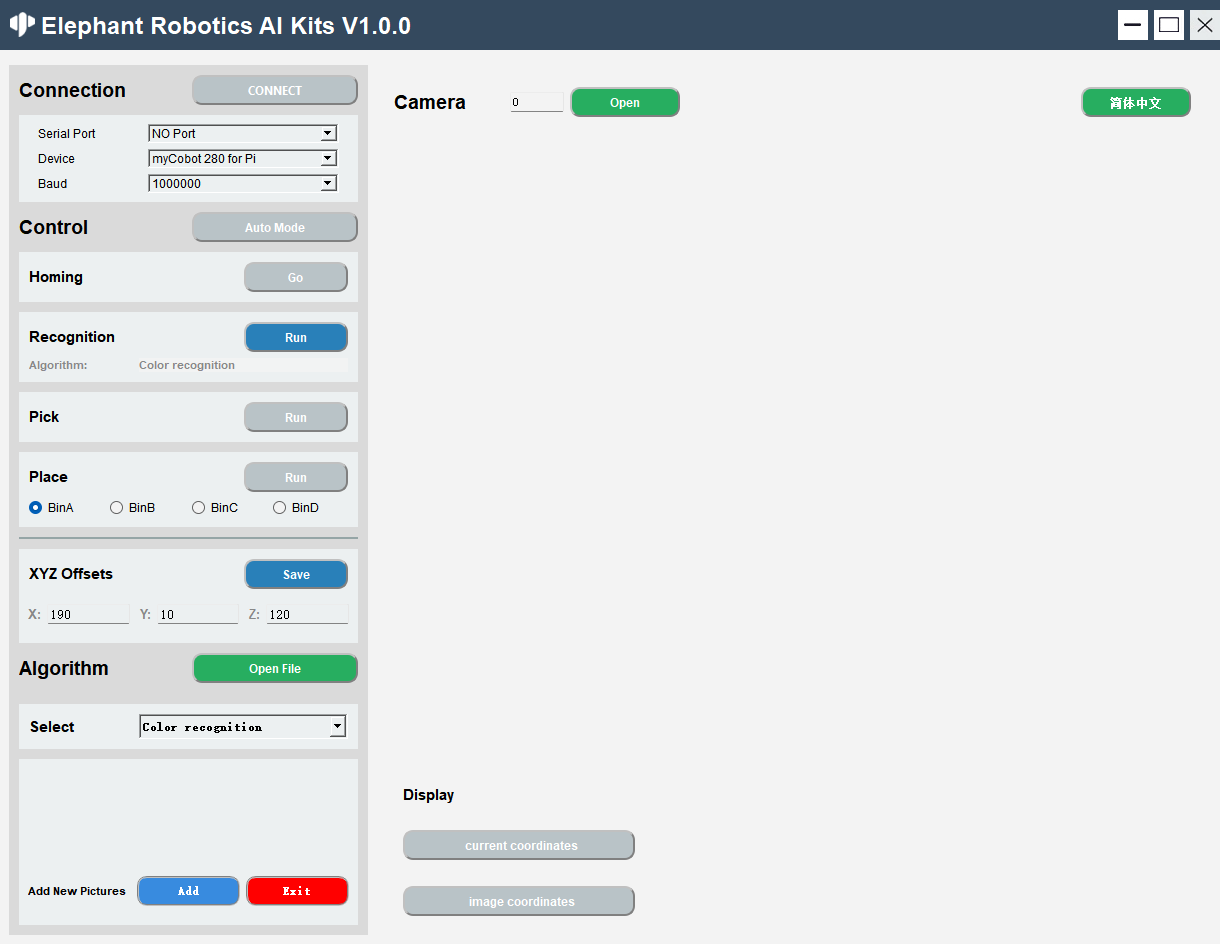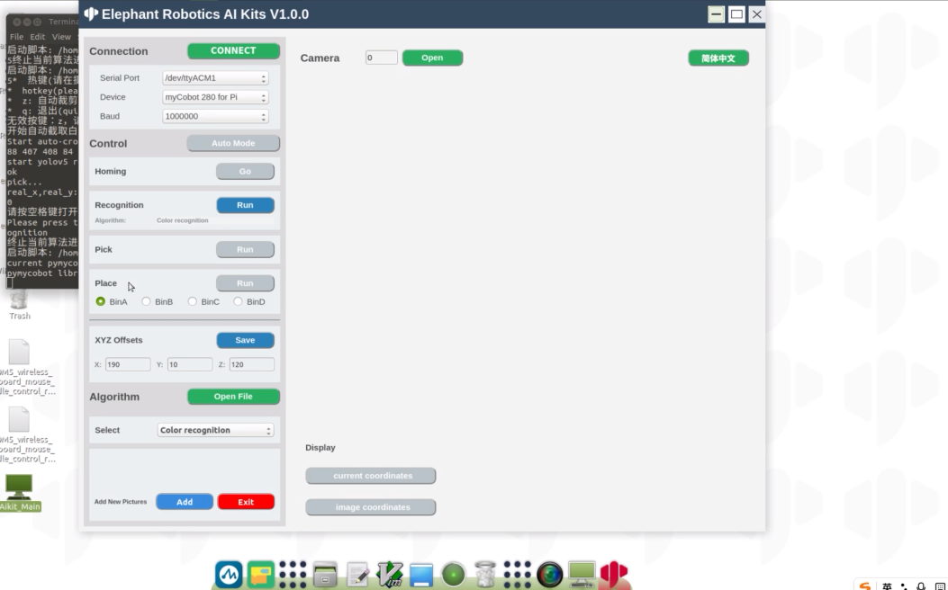 After the system boots up, the program automatically launches. This program supports color recognition, shape recognition, feature point image recognition, AR QR code recognition, YOLOv5 image recognition, the AiKit_UI program, the handle control program, the myCobot adaptive gripper example, the myCobot five-finger dexterous hand example, and the stag code tracking example.