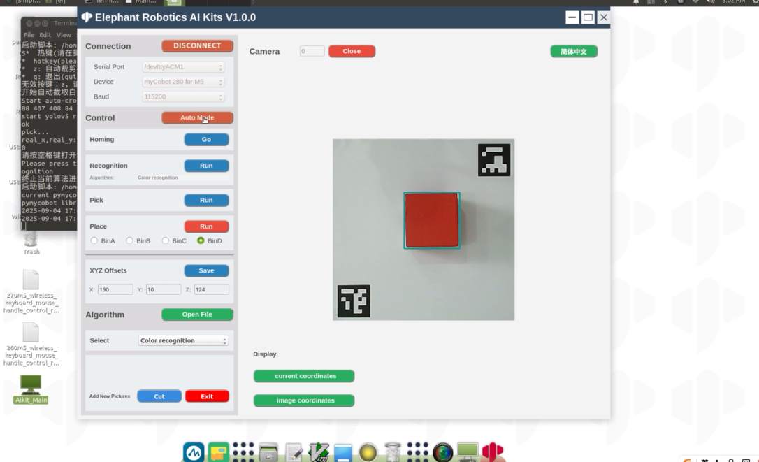 Fully automatic mode, after clicking the 'Auto Mode' button, the recognition, grabbing, and placing will always be on; click the 'Auto Mode' button again to turn off the fully automatic mode.