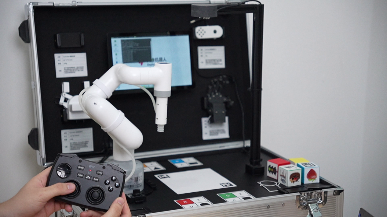 The handle allows you to control the robot's movements, enabling grippers or suction pumps to grasp objects.