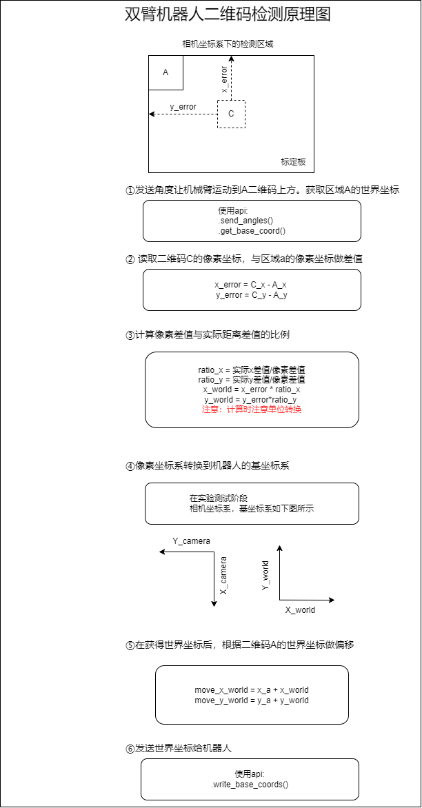 Obtain the value of the pixel center point in the image through the camera, and make a difference with the pixel center point of the starting point to obtain the pixel difference value. Transform the calculated pixel difference according to the scale set by the calibration. Converted to the difference in the world coordinate system, after the robot arm obtains the world coordinate of the starting point, it can obtain the actual world coordinate to be grasped according to the calculated difference of the world coordinate. Send the coordinates to the robotic arm to realize positioning and grabbing.