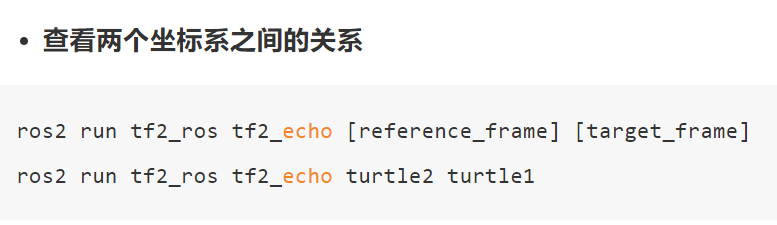 A: 指的是如果你想查看名为 "turtle1" 的坐标系相对于名为 "turtle2" 的坐标系的变换关系,可以使用这个指令,通俗一点来说就是当你运行这个命令时,它会告诉你一个物体("turtle1")相对于另一个物体("turtle2")的位置和方向信息。就像在地图上你可以知道一个城市相对于另一个城市的位置一样