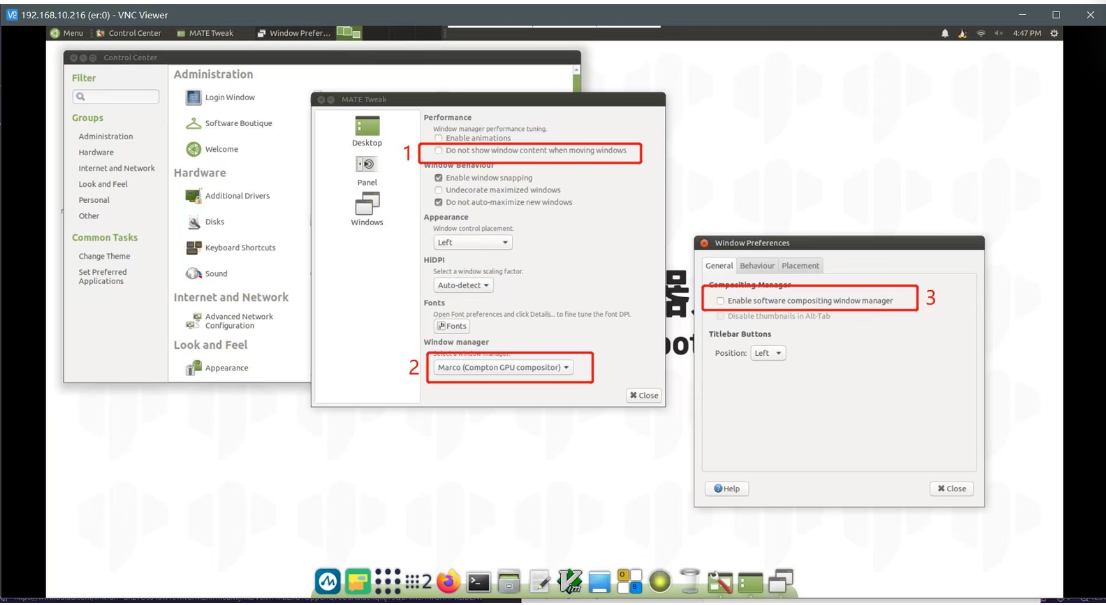 A: 如果是由于在vnc中拖动任何窗口造成的卡顿断连,可以按照下面的图片做一些配置,选项需要与下面的图片一致。成功设置后,将解决由于拖动窗口导致VNC断开的问题。