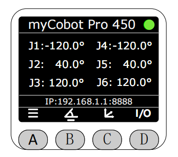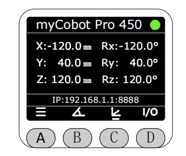 可以通过屏幕底部的按键切换显示不同的机械臂信息,按下C键显示机械臂当前的坐标信息以及静态IP信息。