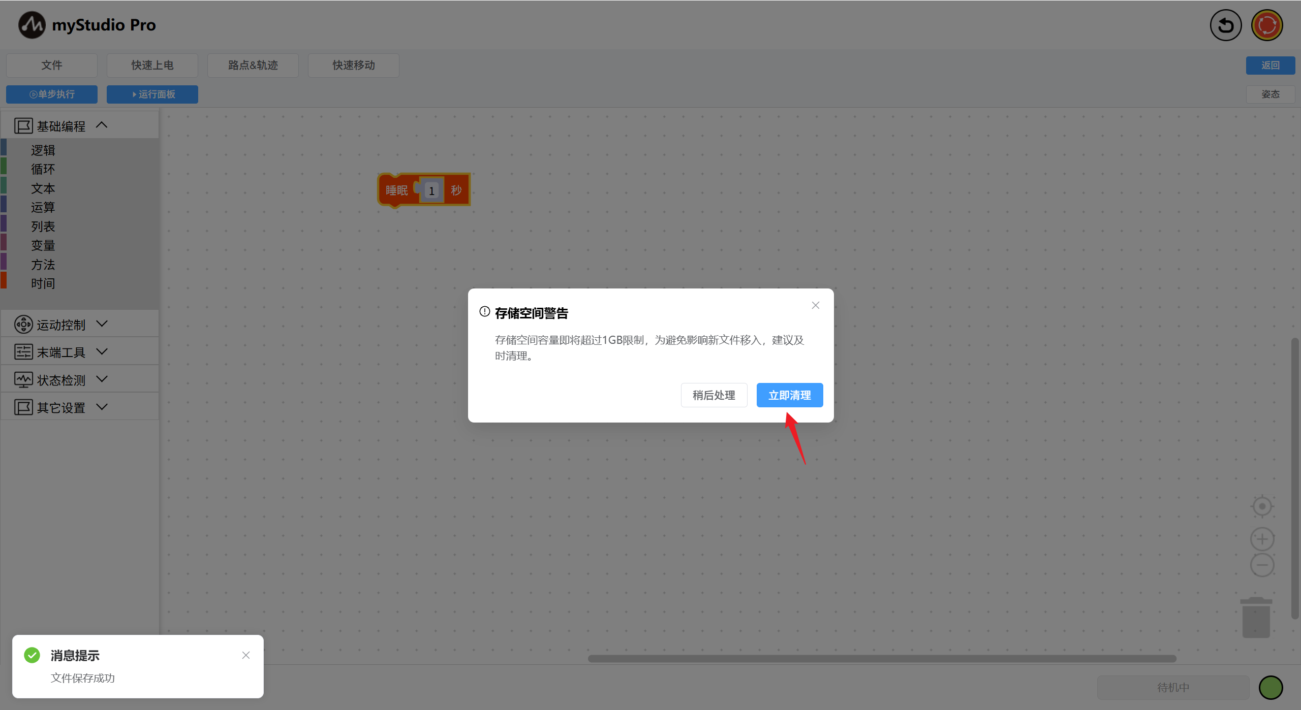 注:文件的容量有1GB大小限制,当文件管理操作检测到空间大于0.9GB且小于1GB时,会有容量空间警告弹窗提示,此时您可以点击立即清理按钮,并对不再使用的文件进行删除处理,以释放容量空间。
