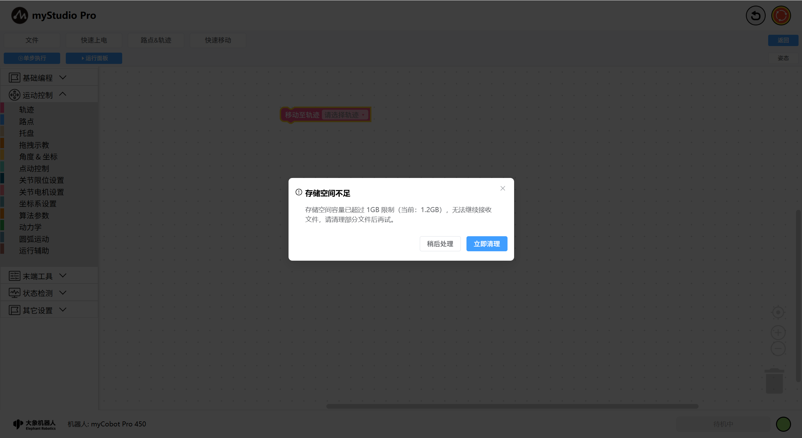 当检测到容量空间已满时,会有存储空间不足弹窗提示,文字信息中会展示目前文件空间容量,此时您可以点击立即清理按钮,对不再使用的文件进行删除处理,以释放容量空间,保证文件管理相关功能操作的正常使用。
