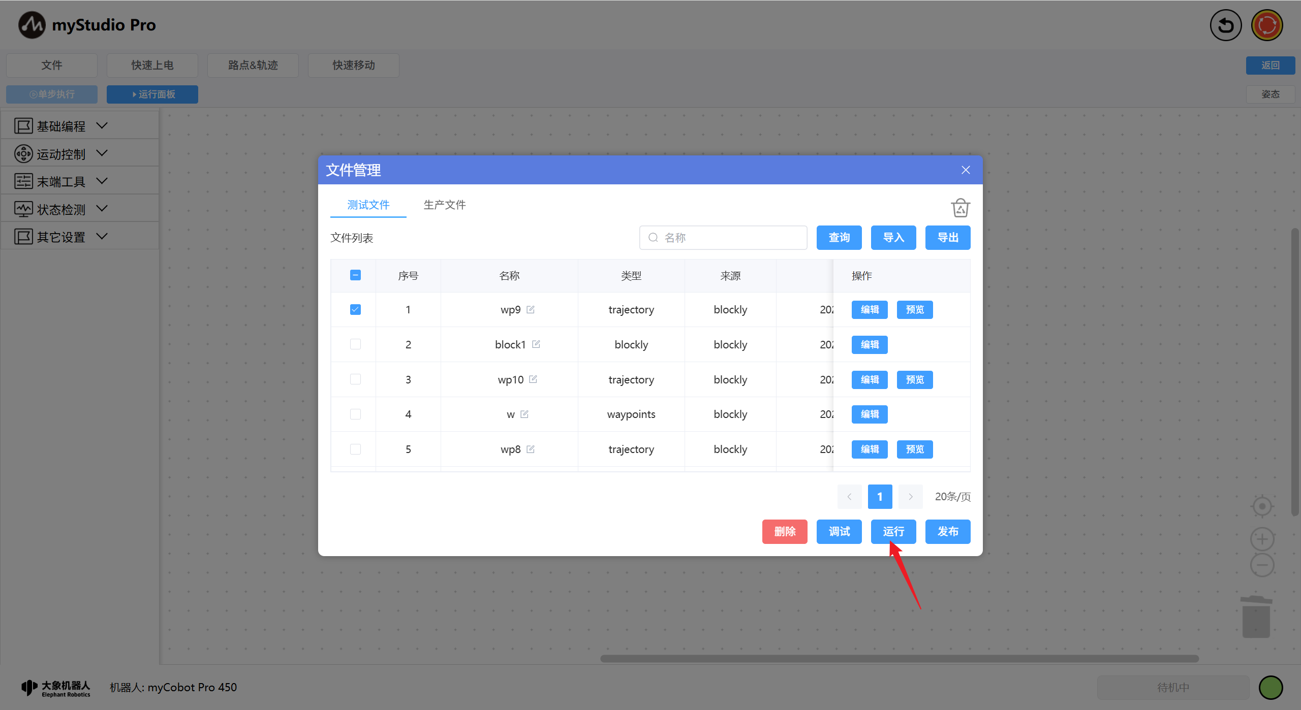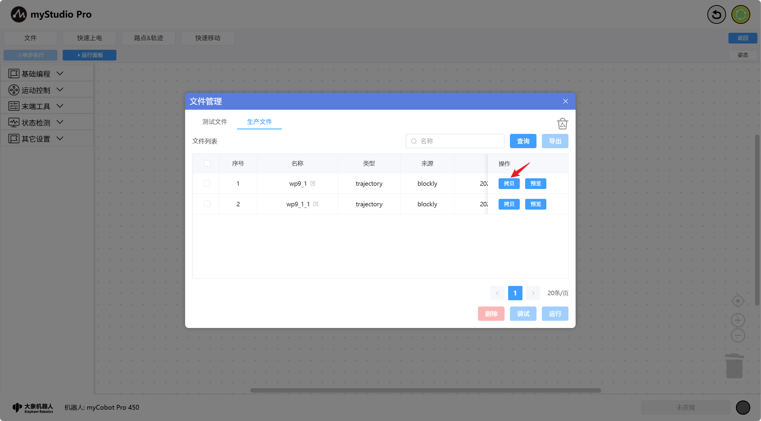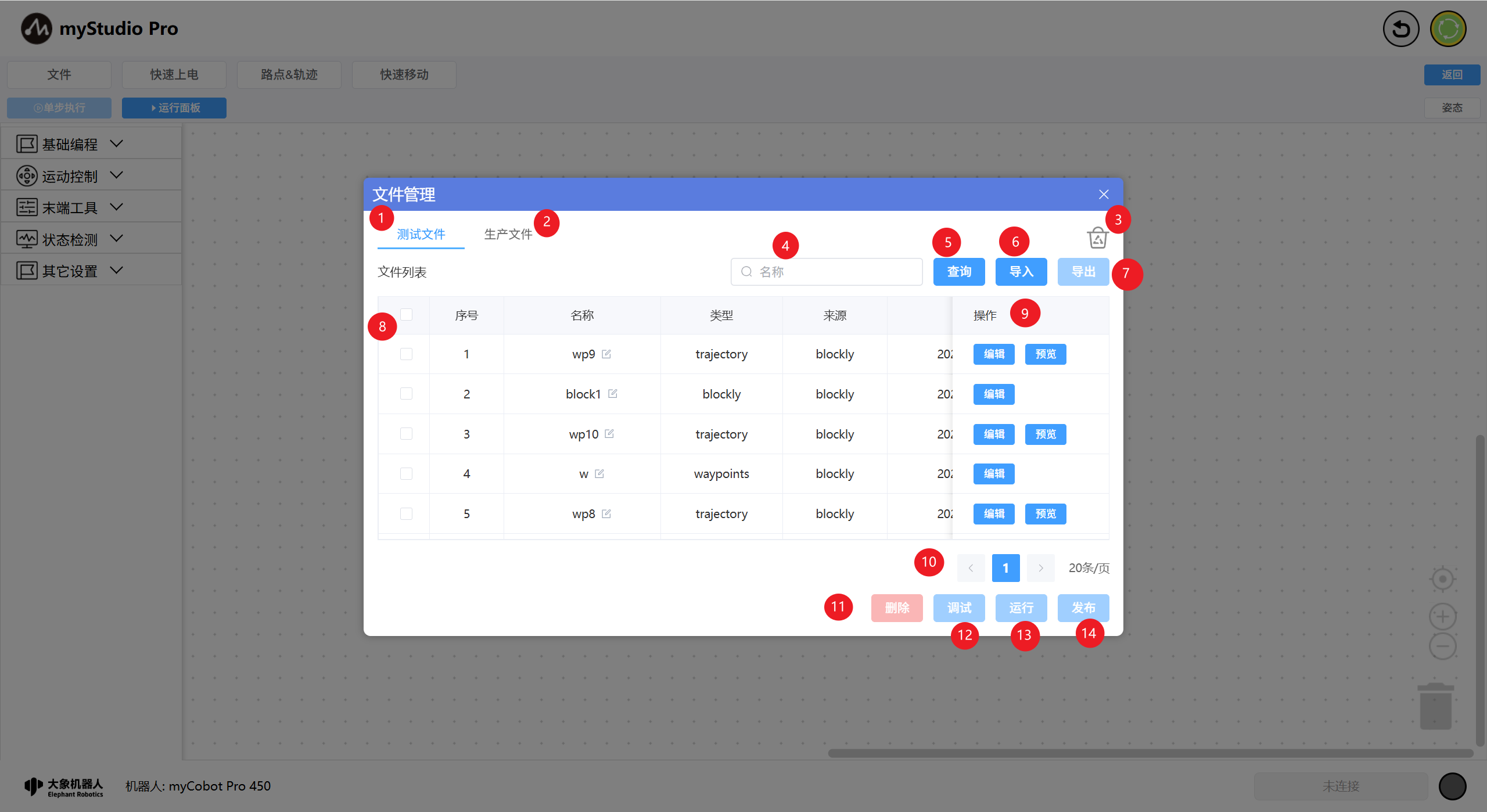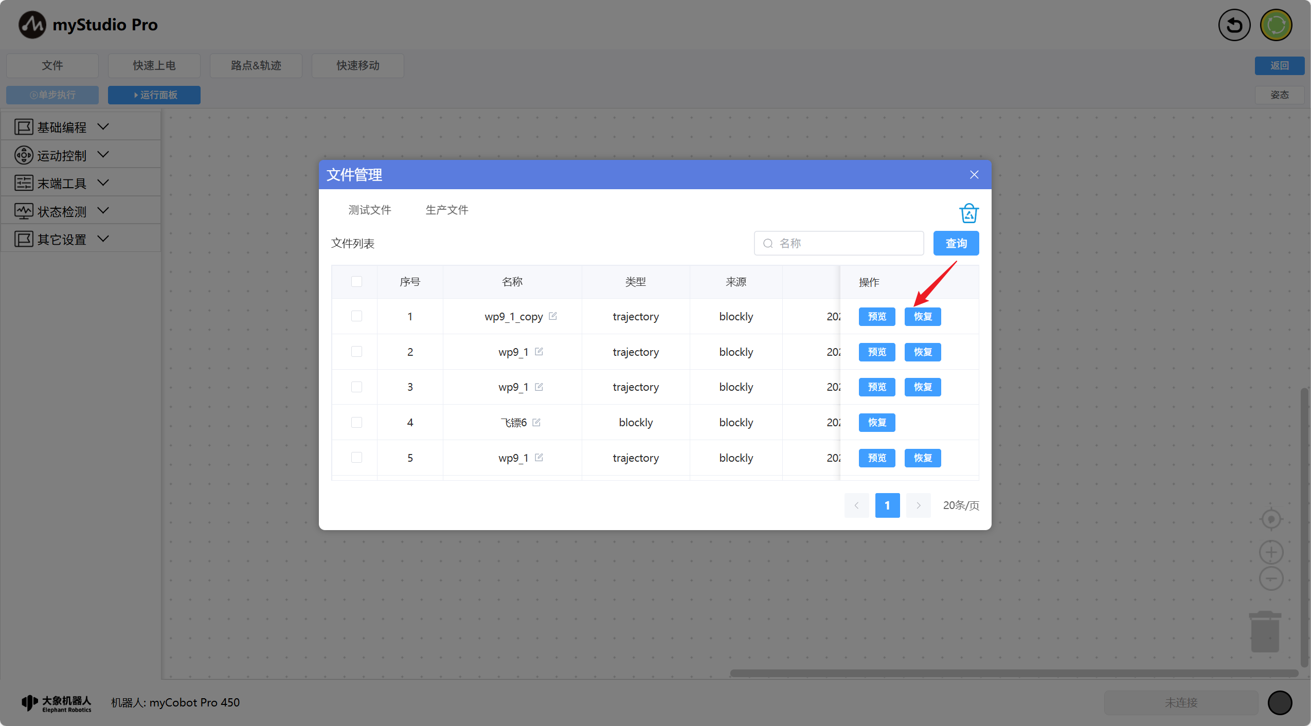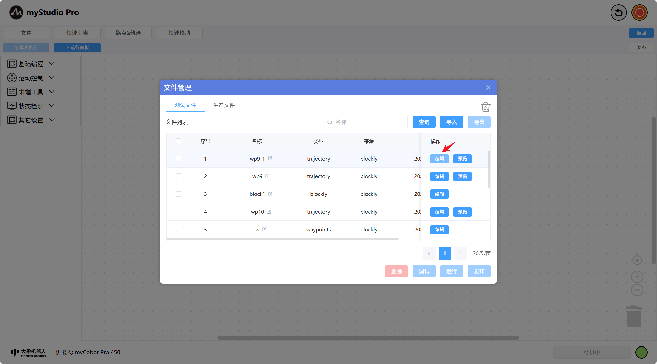 | 9 | 单文件操作按钮,包括以下功能按钮:编辑-将文件内容加载到工作区,预览-仅适用轨迹文件,3D模型对轨迹点位进行模拟运行,拷贝-将生产空间文件拷贝到测试空间,恢复-回收站空间文件恢复到测试空间。 |