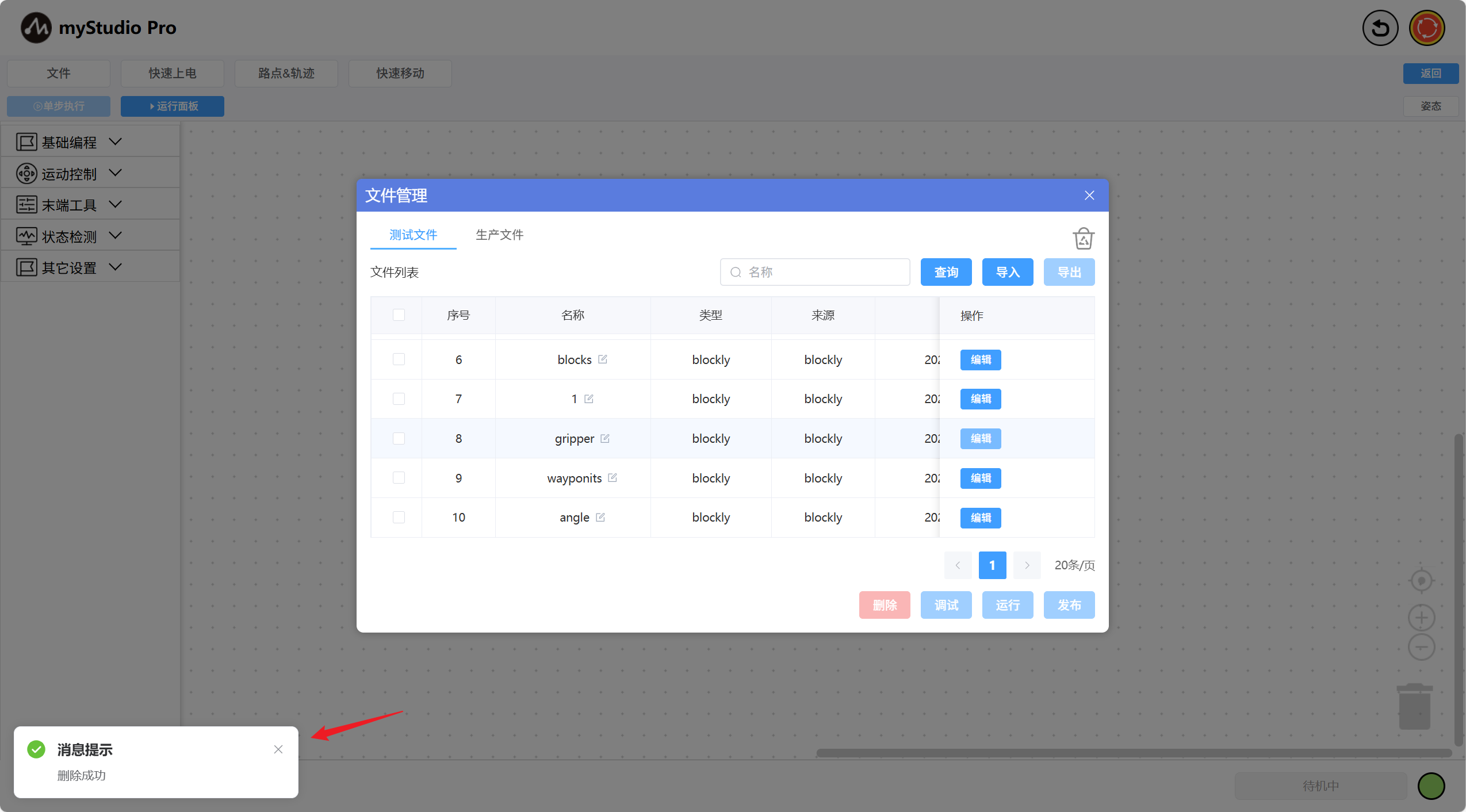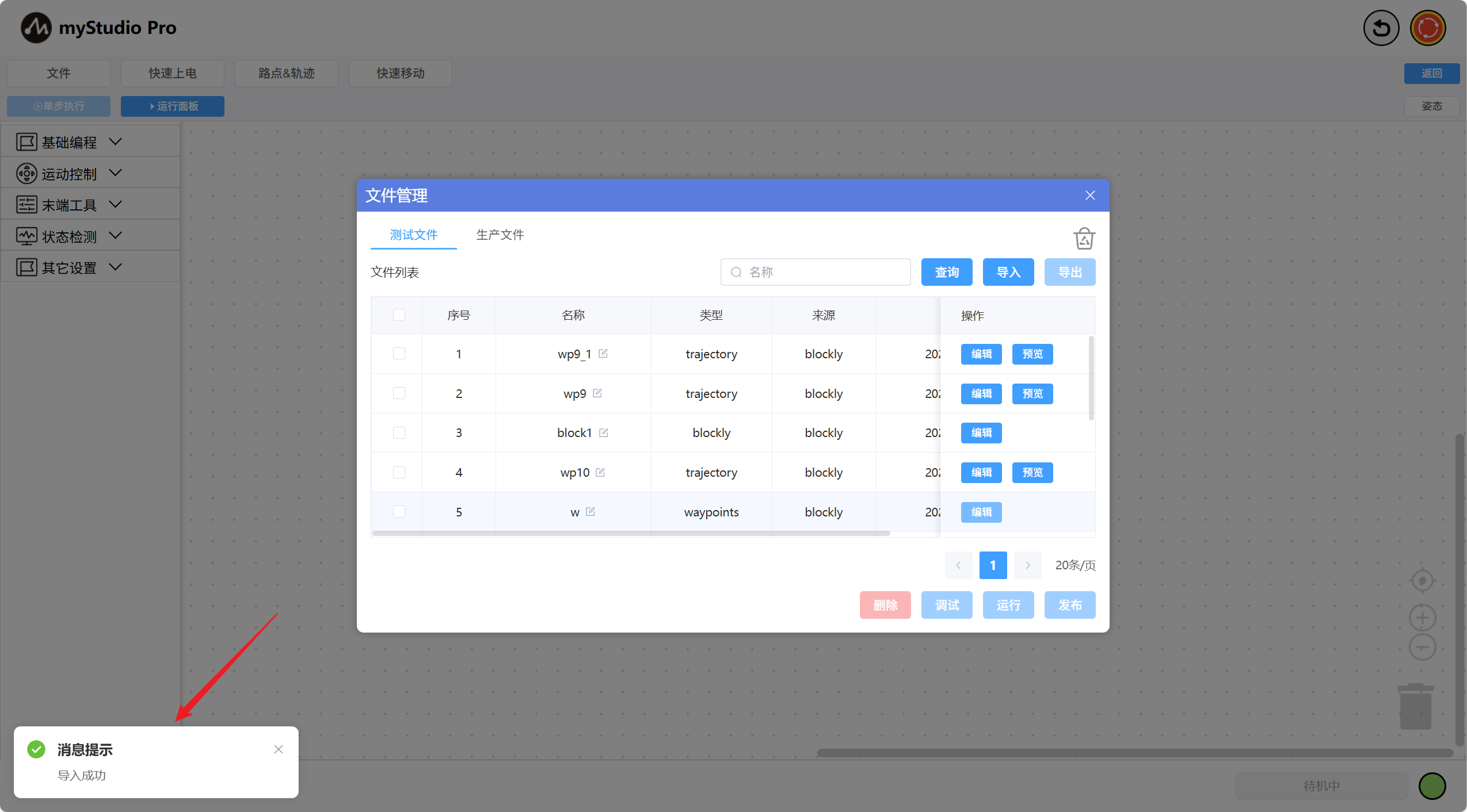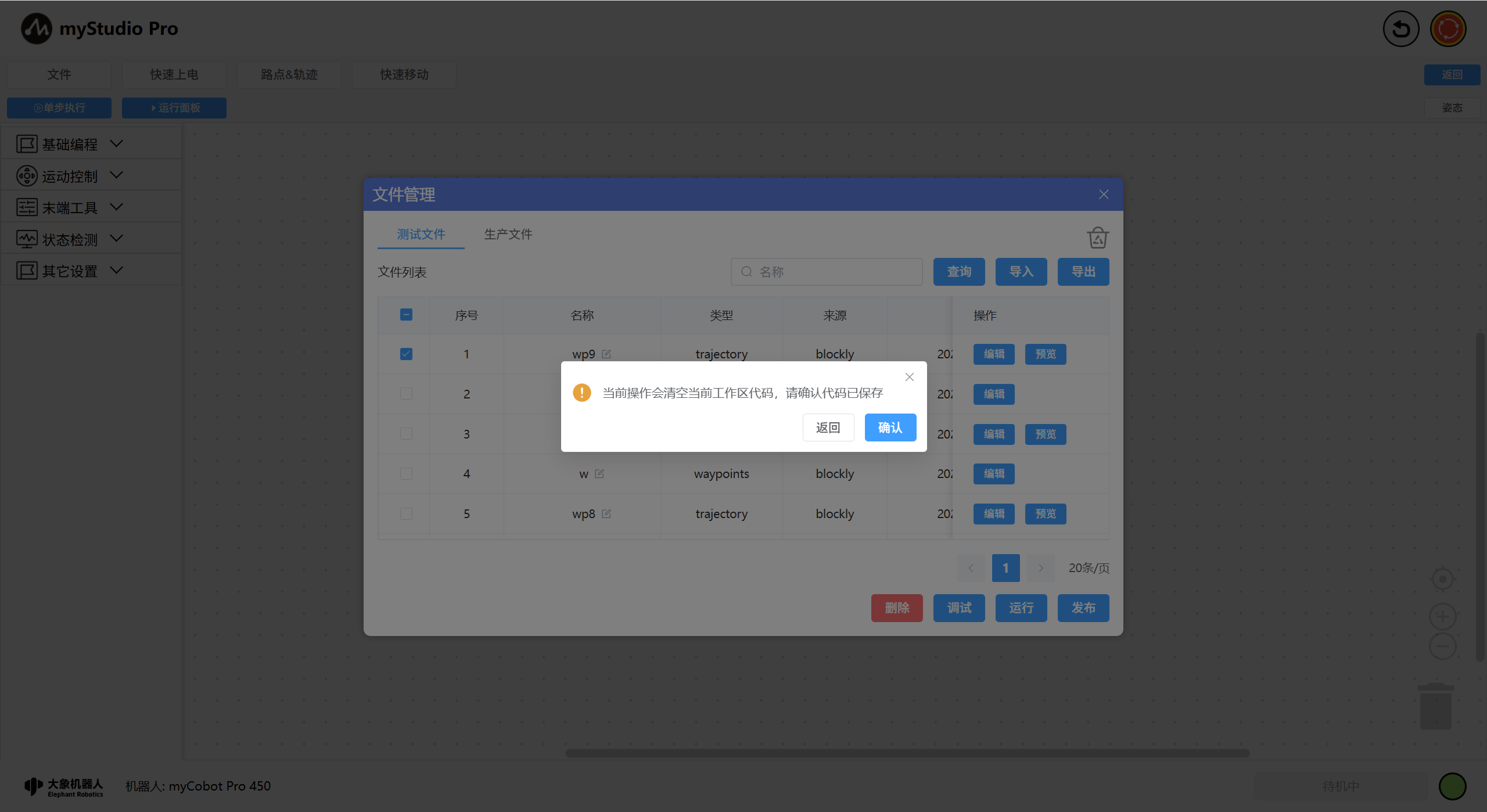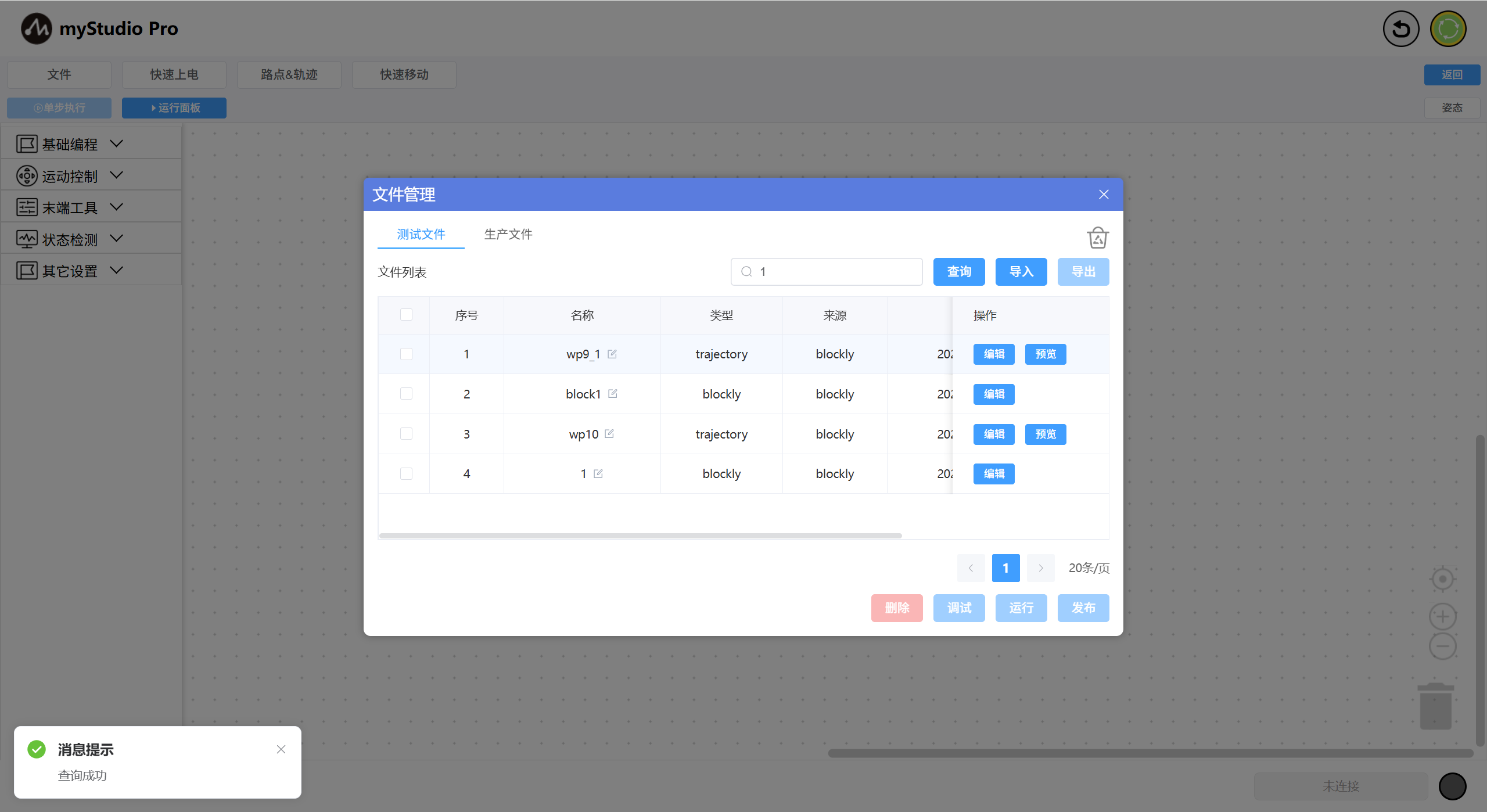 功能描述:通过文件管理模块,可以方便的对不同文件空间下的文件进行保存、导入、导出等操作。文件列表打开方式有两种,首页-打开文件或myBlockly页文件操作菜单-打开选项,即可打开文件管理列表,同时加载您保存好的文件内容包括工作区、路点、轨迹文件(关于如何保存工作区,请点这里)。