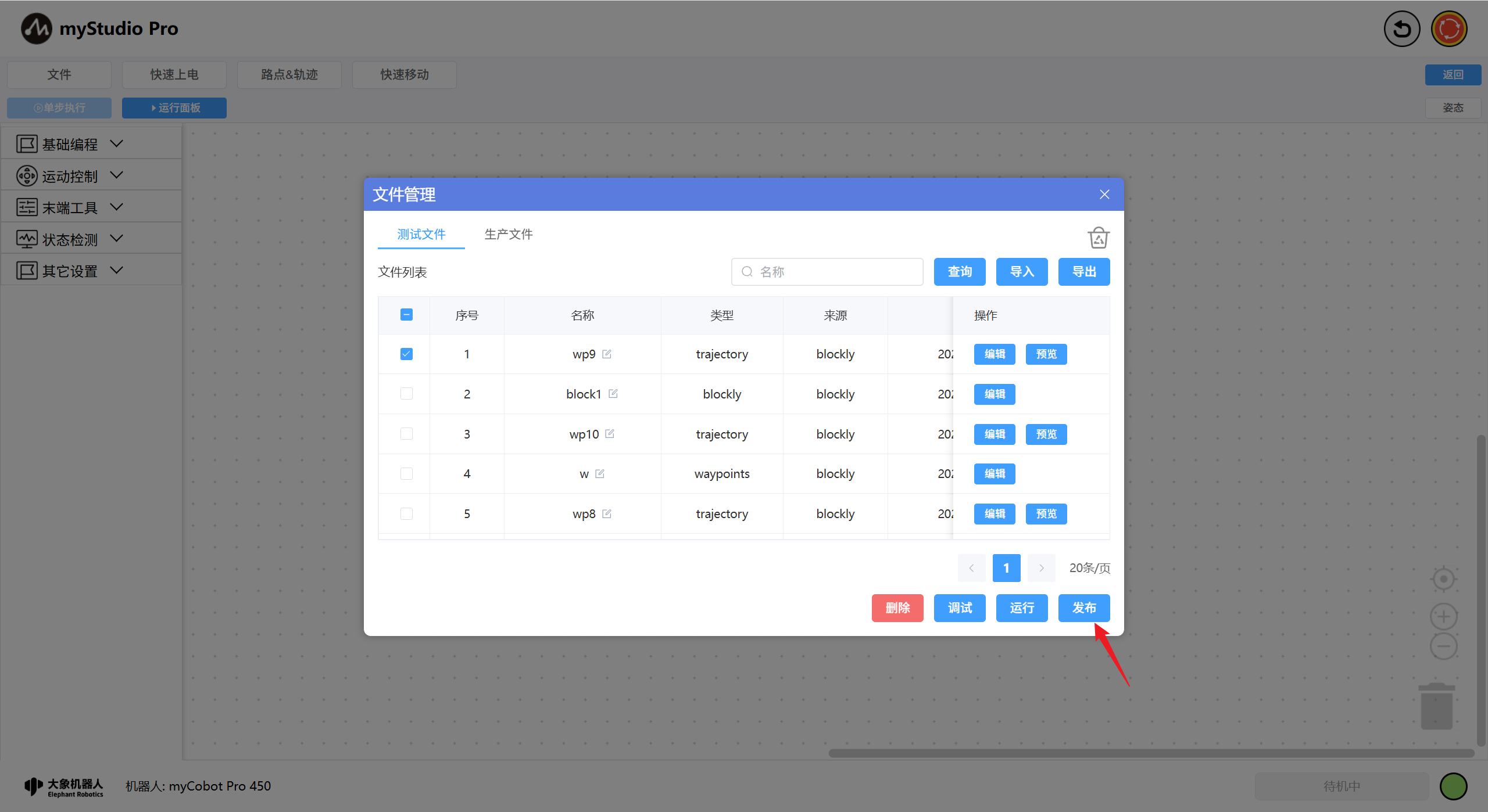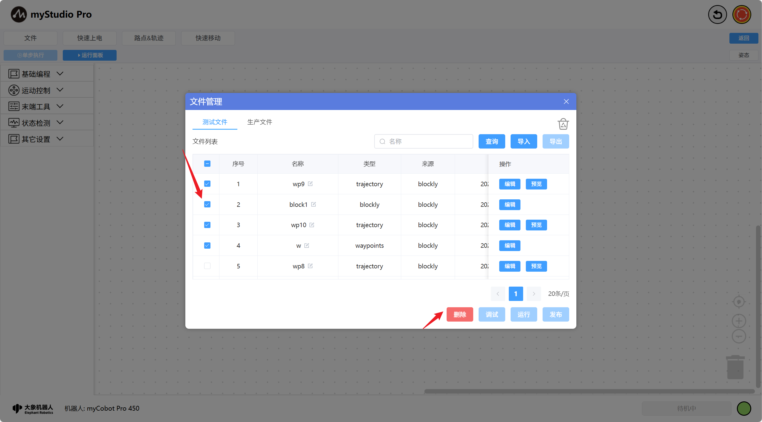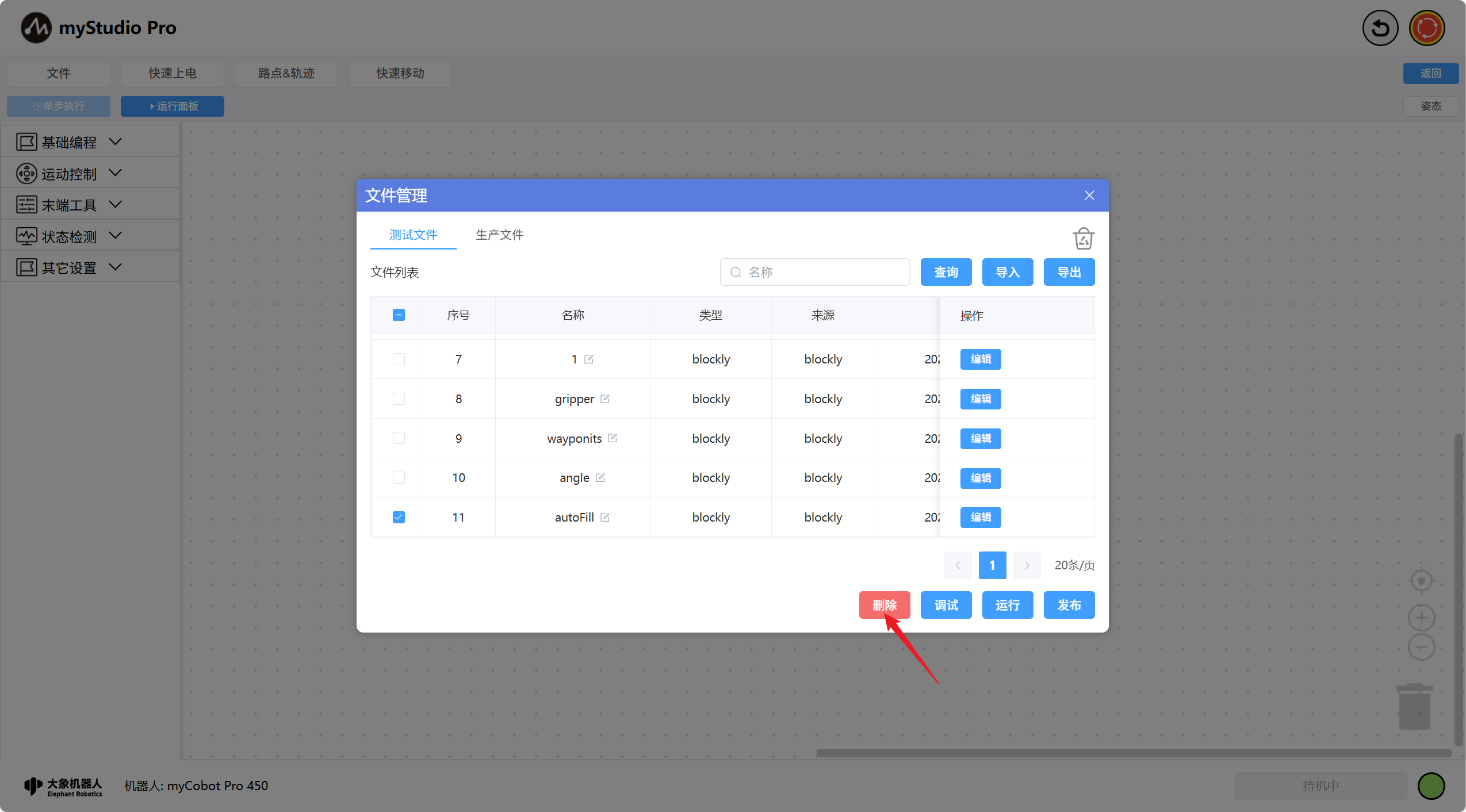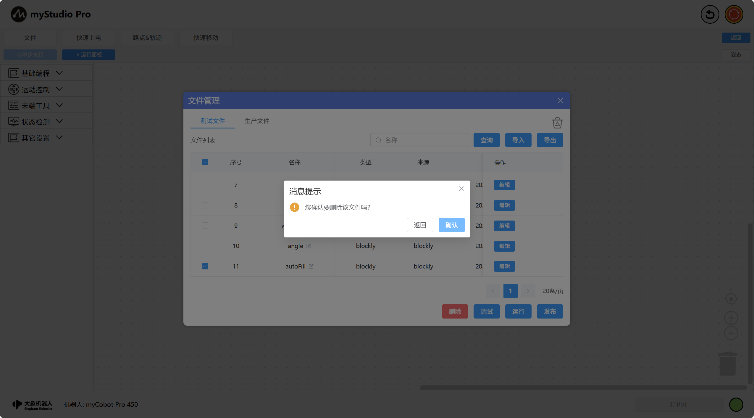 功能描述:通过文件管理模块,可以方便的对不同文件空间下的文件进行保存、导入、导出等操作。文件列表打开方式有两种,首页-打开文件或myBlockly页文件操作菜单-打开选项,即可打开文件管理列表,同时加载您保存好的文件内容包括工作区、路点、轨迹文件(关于如何保存工作区,请点这里)。