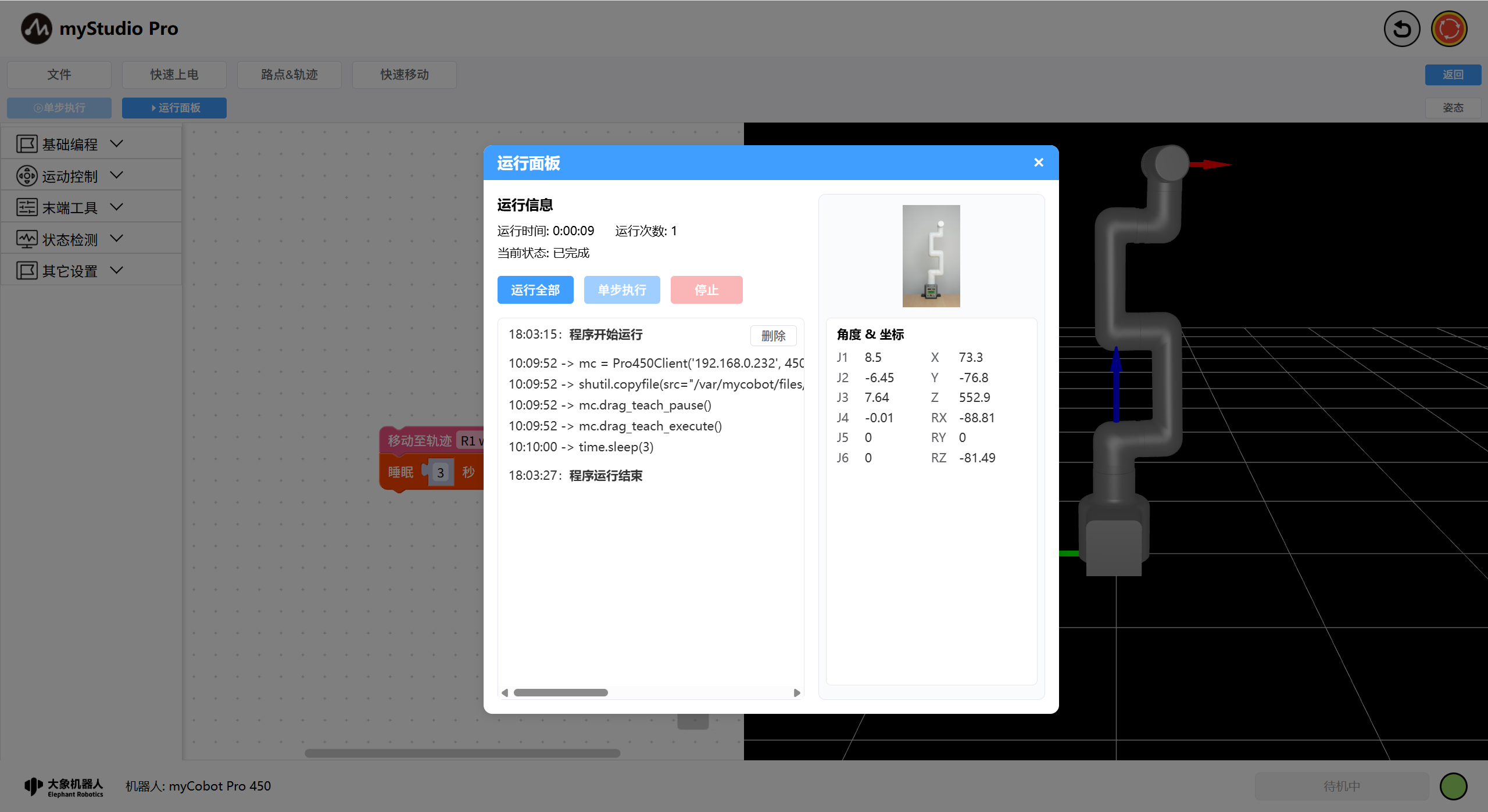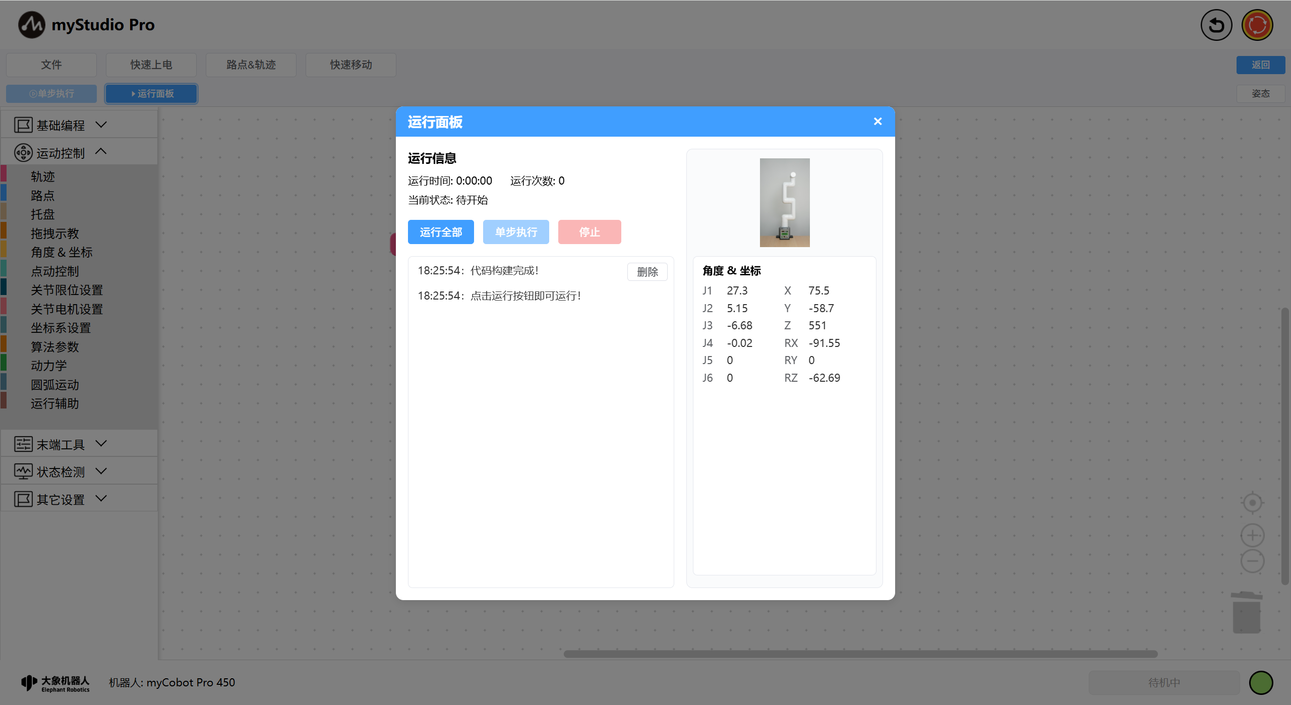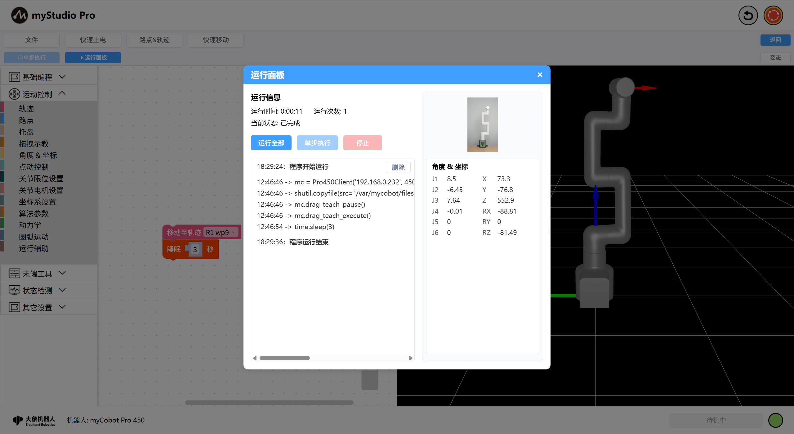 最后,点击运行面板按钮,打开面板后,点击运行全部按钮开始执行代码,运行面板右侧会实时显示关节、角度坐标,同时3D模型也会仿真运动。