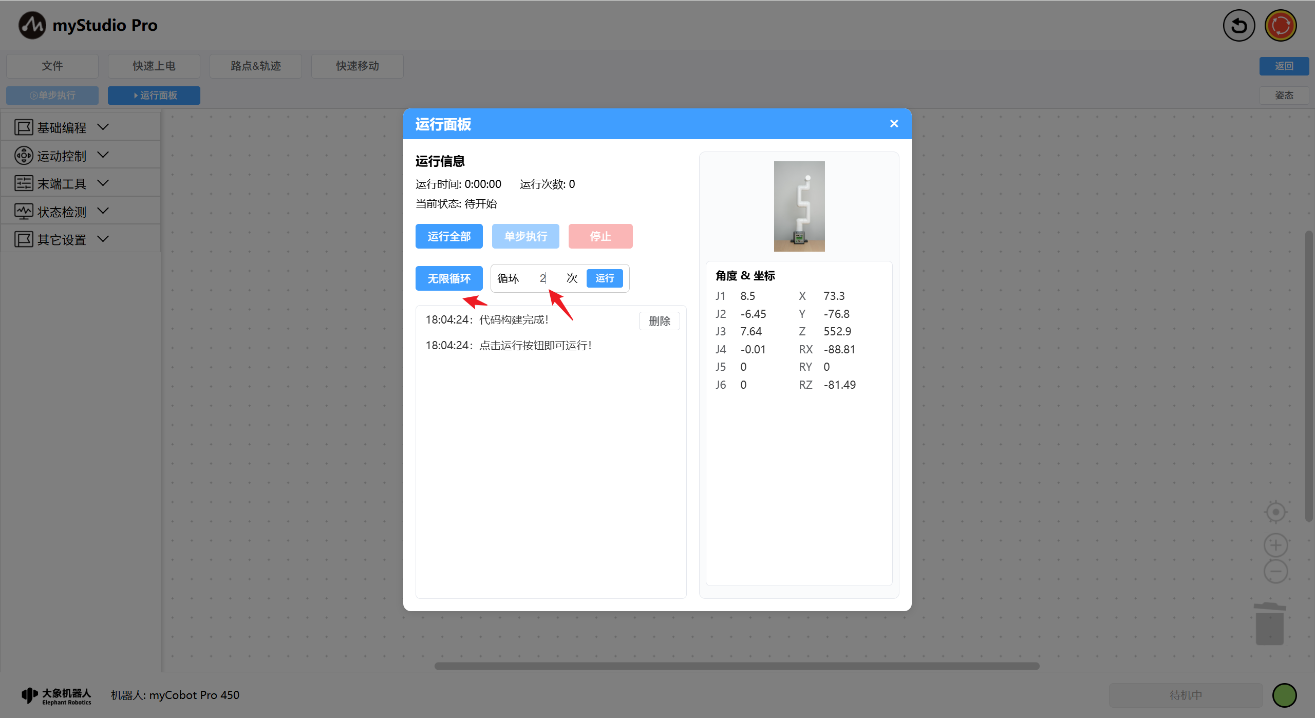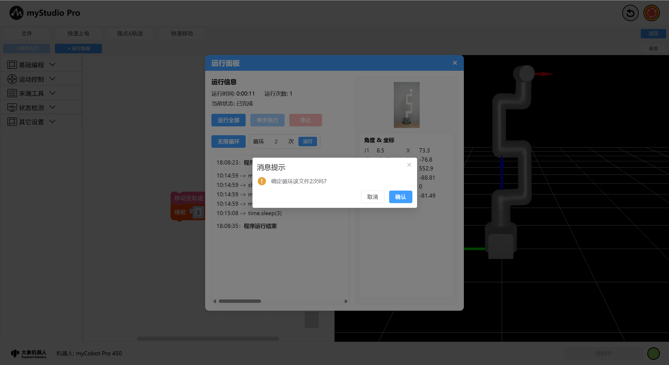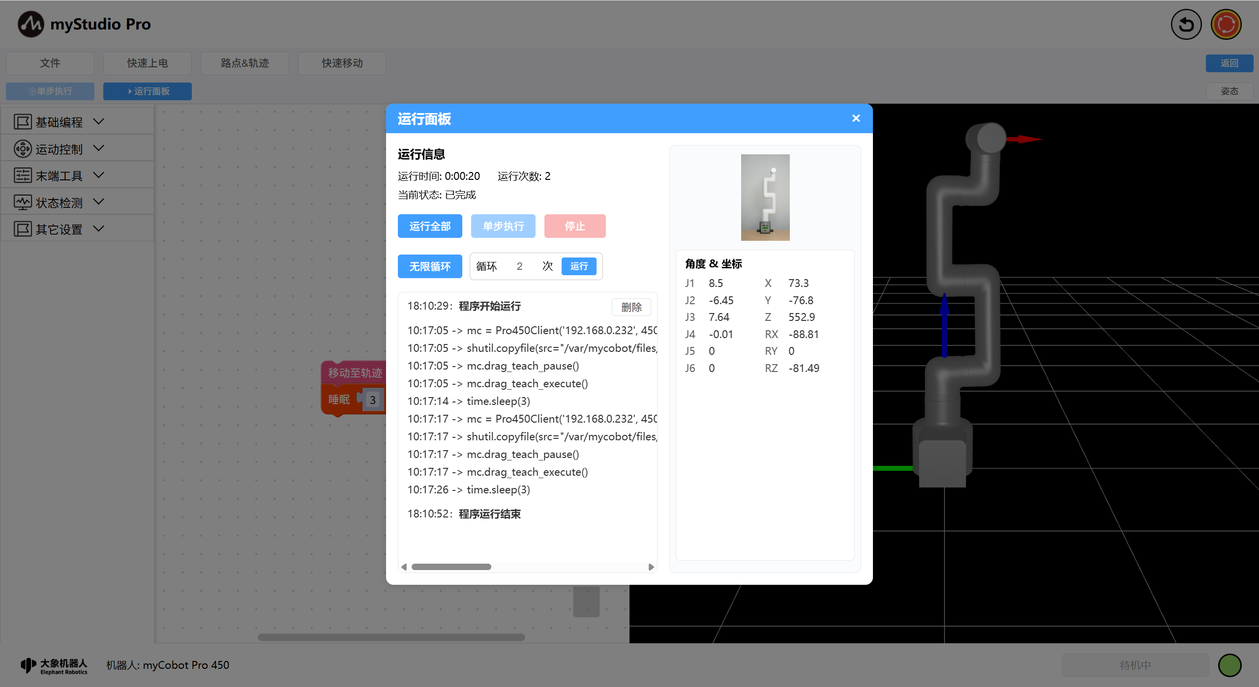 最后,点击运行面板按钮,打开面板后,点击运行全部按钮开始执行代码,运行面板右侧会实时显示关节、角度坐标,同时3D模型也会仿真运动。