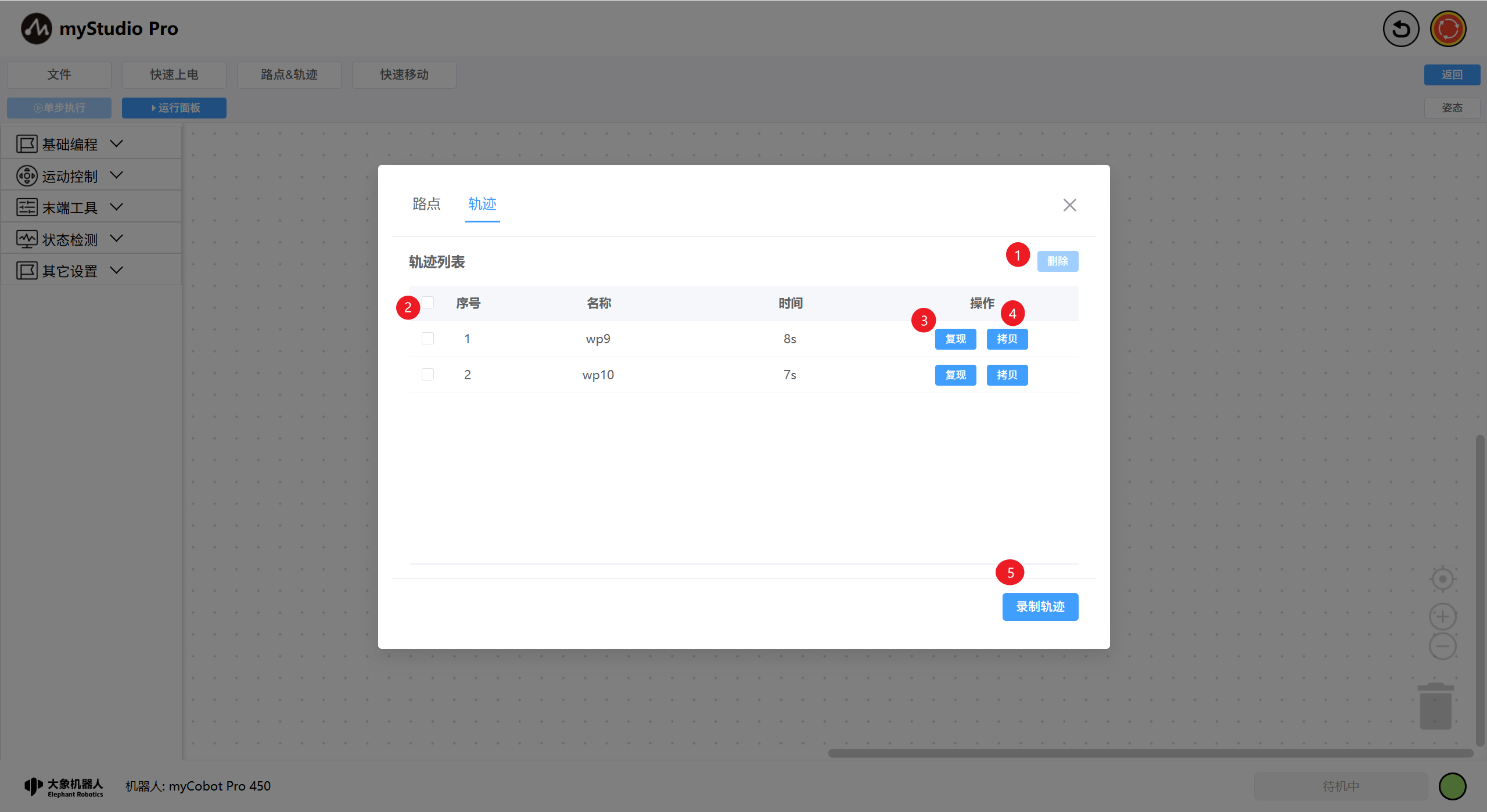 | 5 | 点击“录制轨迹”按钮,机械臂会二次确认是否进行轨迹录制操作,确认后可开始录制(最长60s,超过将自动停止录制)。 |