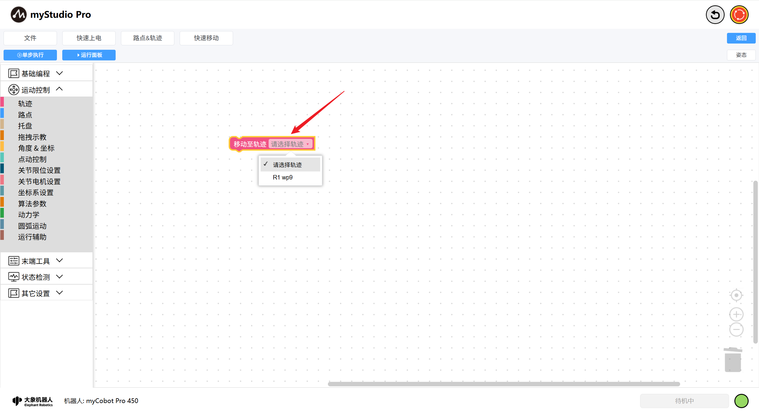 再myBlockly中选择轨迹积木块,加入到程序编程区。在工作区中点击轨迹积木块的下拉菜单可选择当前轨迹列表页面中的数据。