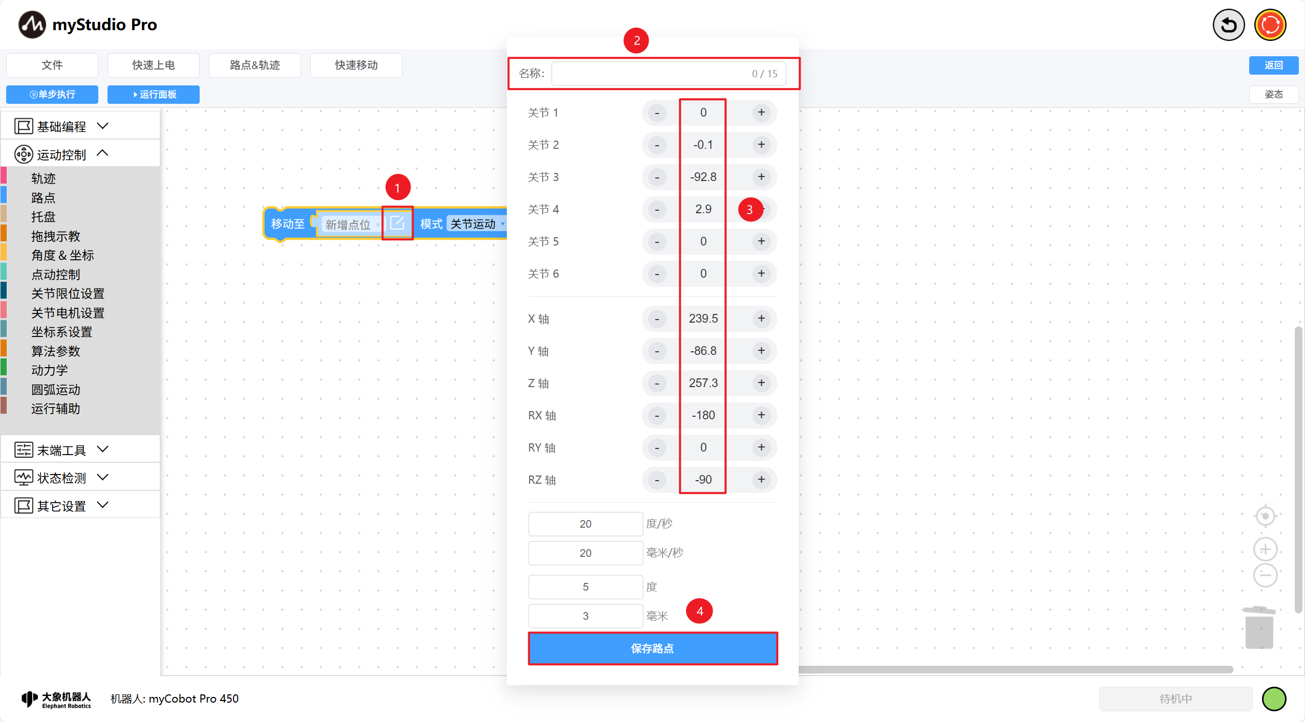 此外,路点积木块可对运动的模式进行修改,关节运动模式:以当前路点的关节信息进行运动,直线运动模式:以当前路点坐标信息进行运动。