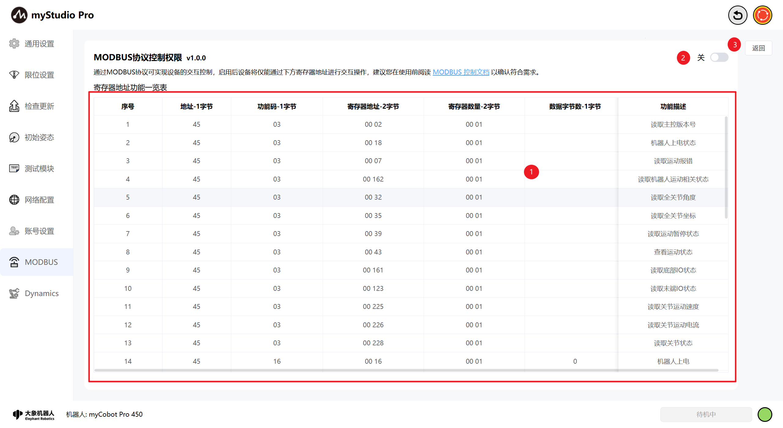 | 2 | modbus控制权限切换按钮,可通过该按钮对modbus权限进行开关控制。 |