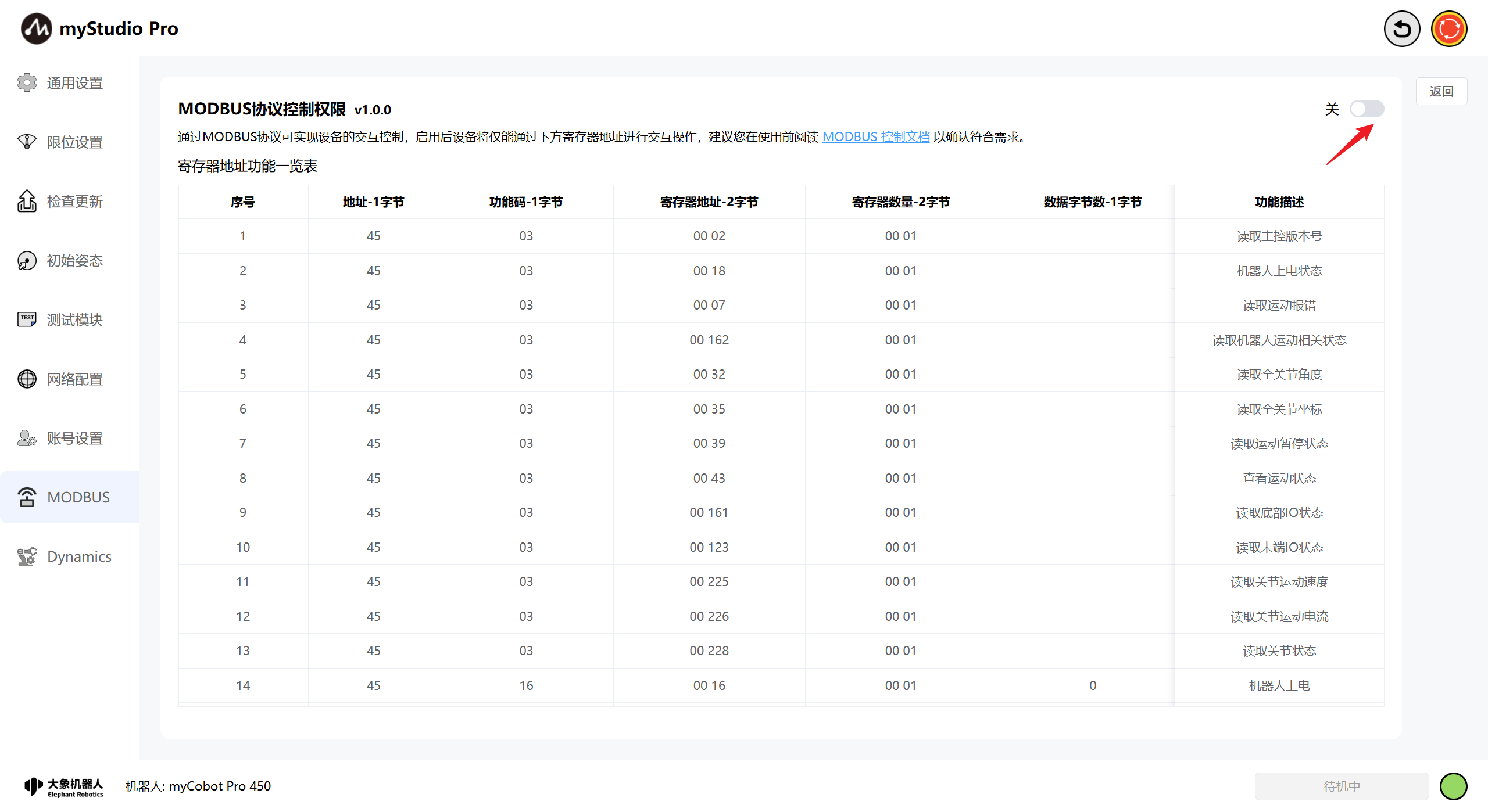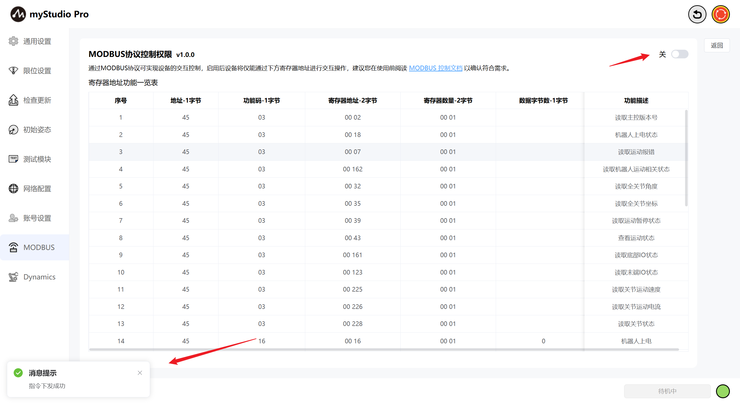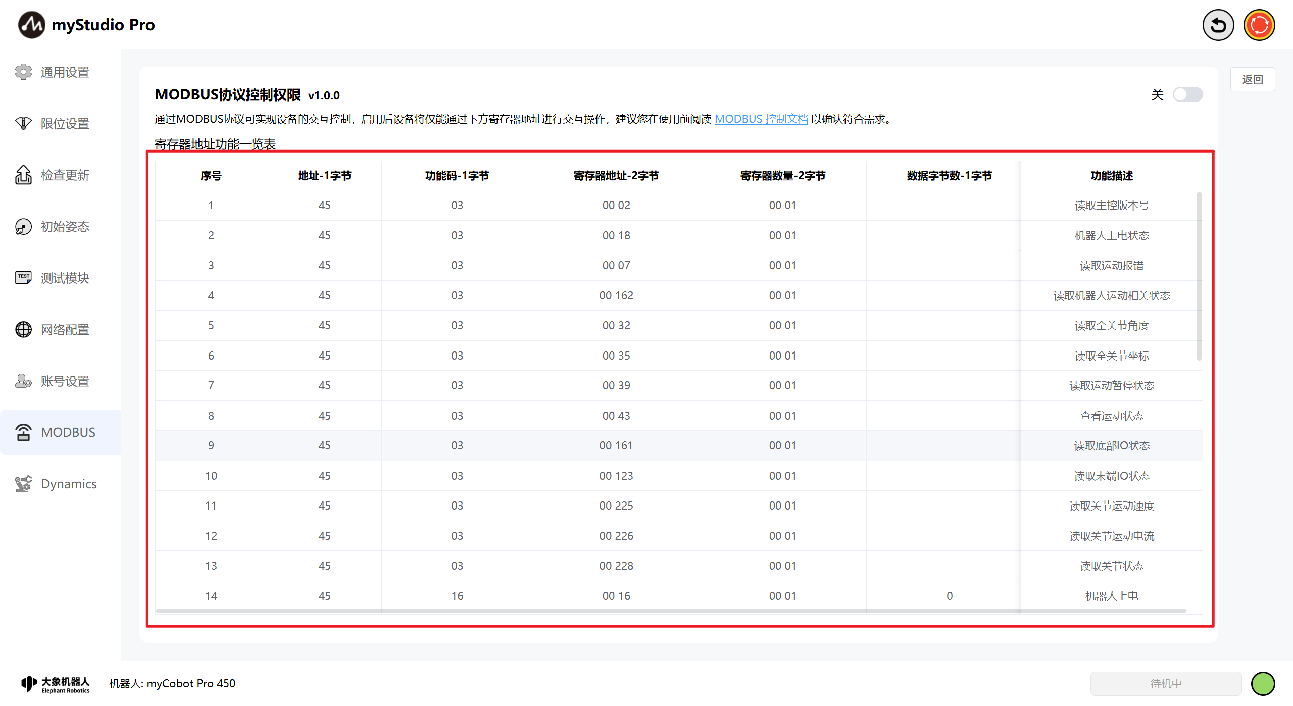 此时,若想恢复myStudio Pro本身的运动控制功能,可将modbus控制关闭即可恢复运动控制。