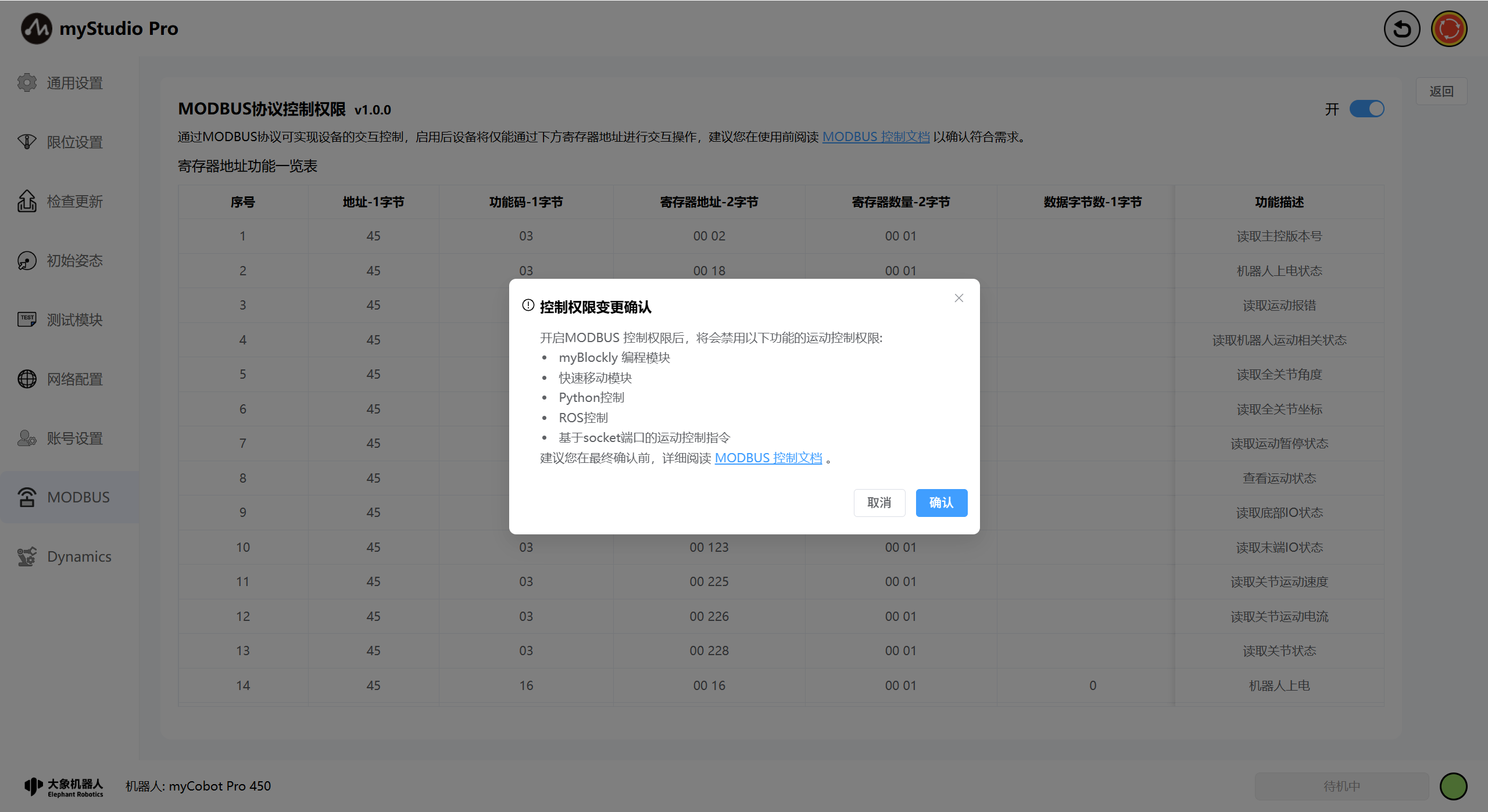 在该页面可进行modbus的控制权限进行切换,当需要开启modbus控制时,会展示控制权限变更确认弹窗,在弹窗中会展示开启modbus时将被禁用的运动控制权限。