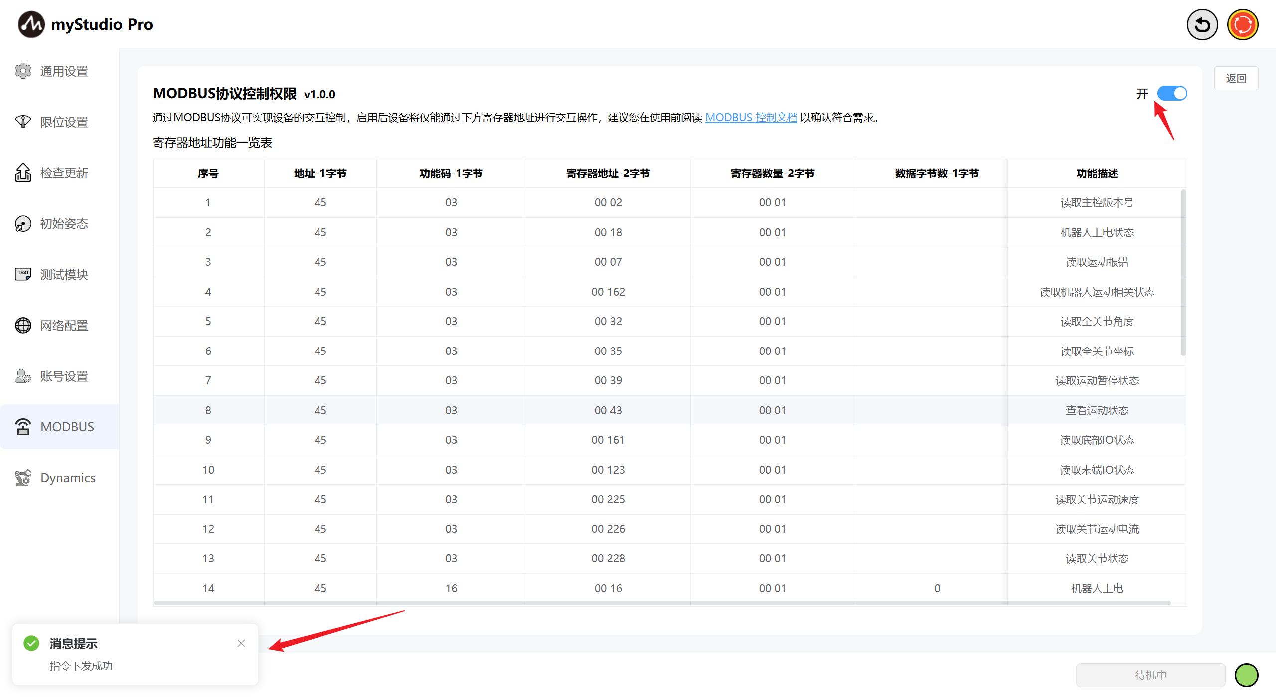 当点击弹窗右下角的确认按钮时,将会真正开启modbus控制,当modbus权限开启成功时页面会有消息提示,同时右上角开关转变为开启状态。