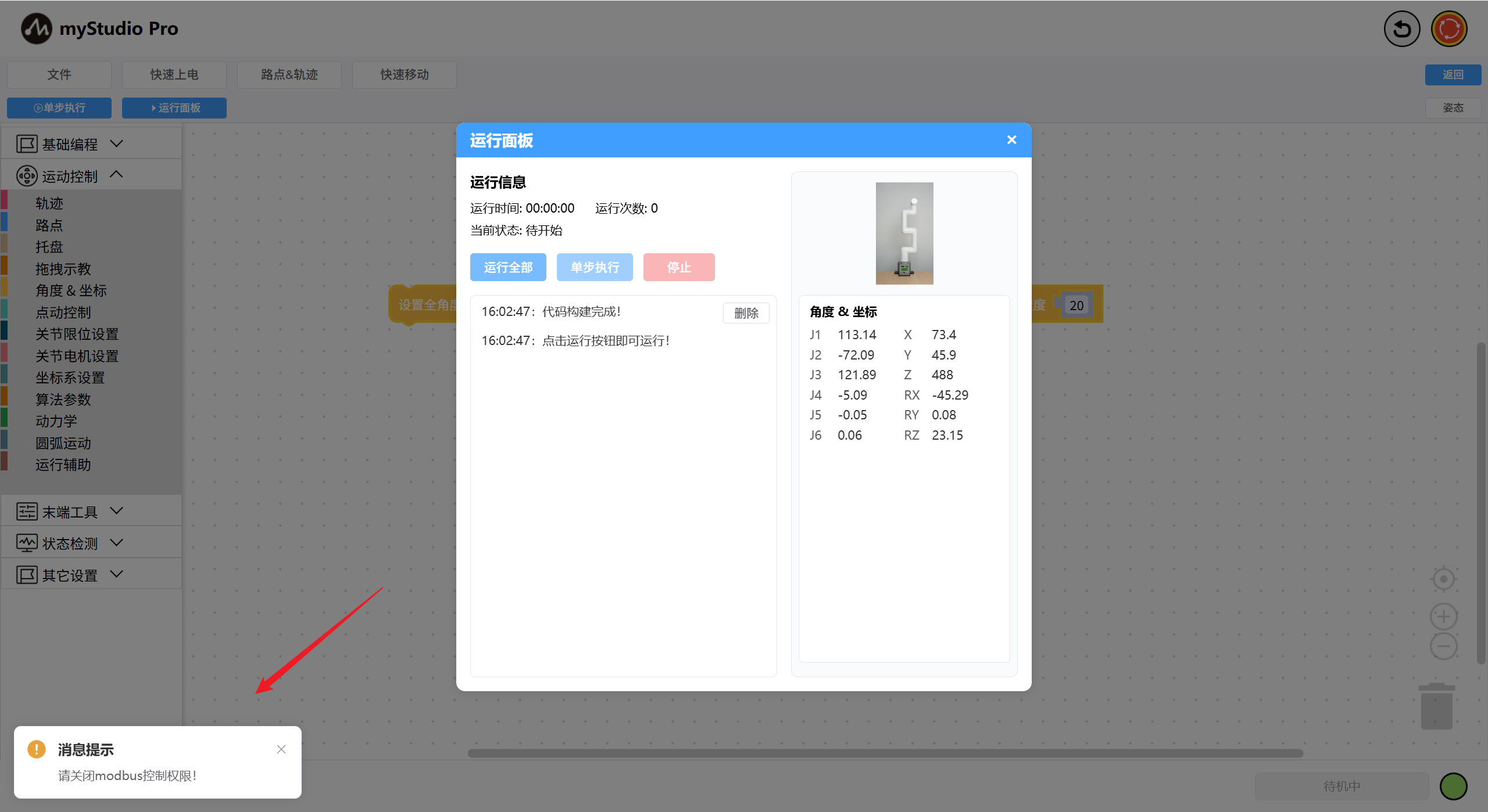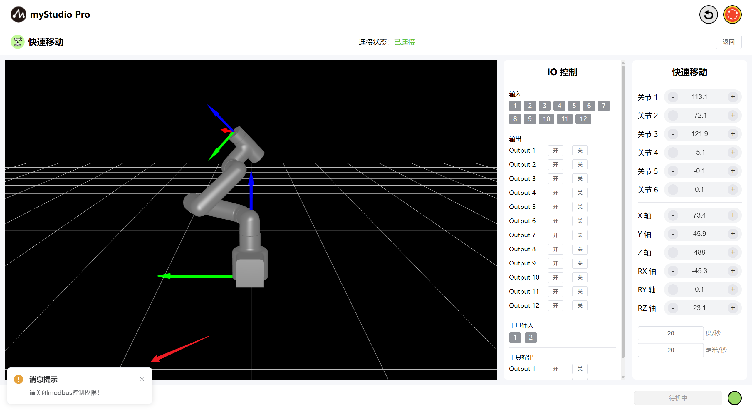 modbus权限开启时myStudio Pro的运动控制权限将被禁用,如myBlockly编程、快速移动等功能。限位设置、参数修改、打包姿态、急停等不受影响,检测到modbus处于开启阶段并尝试进行运动控制操作时,可控制设备的页面左下方将显示提示信息。
