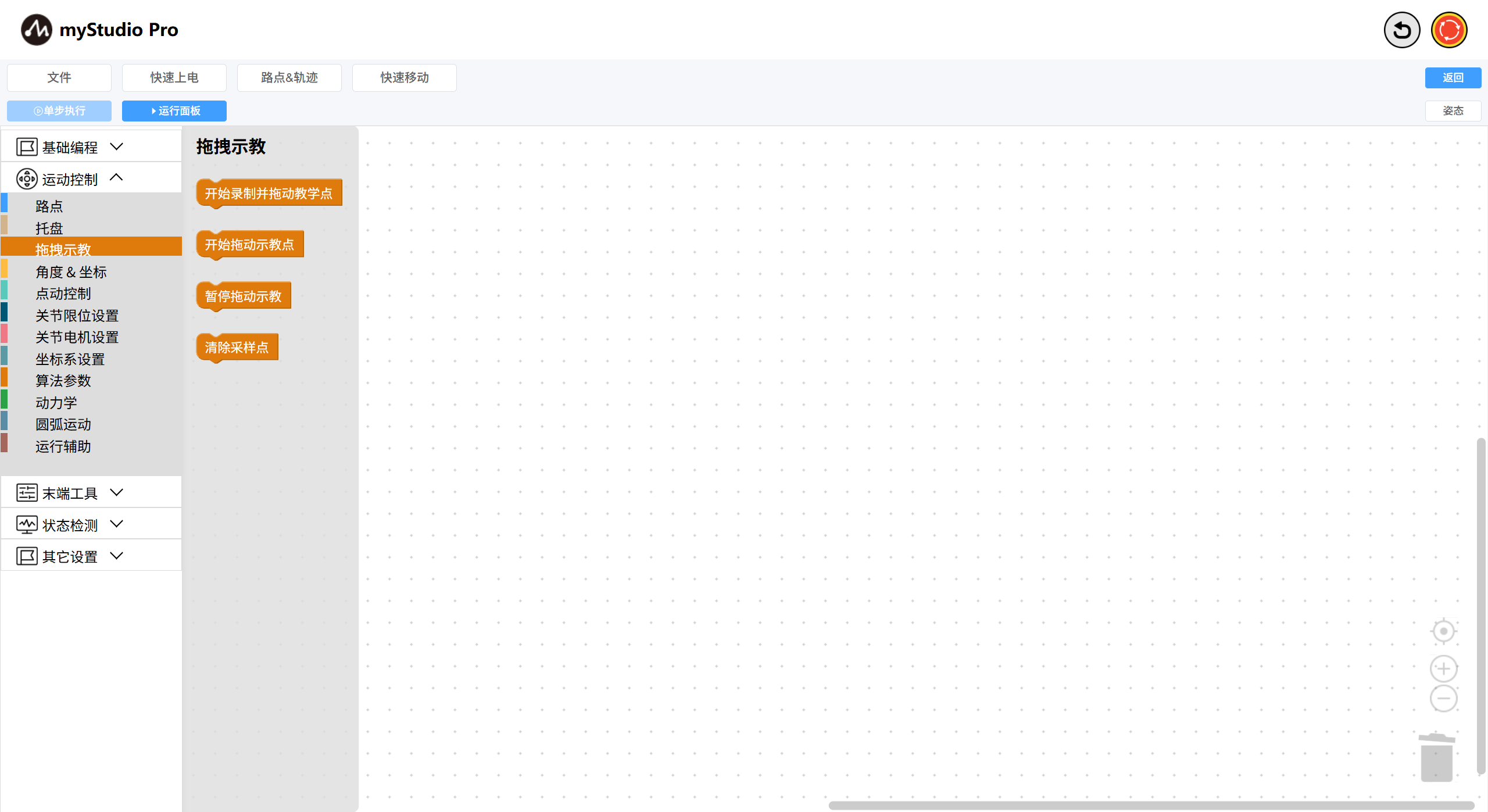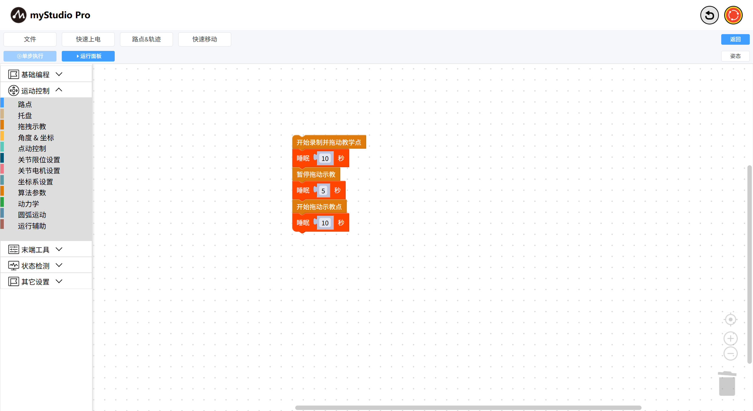- 录制轨迹:执行该积木块后,机械臂关节刹车放松,机械臂现在可以被拖动