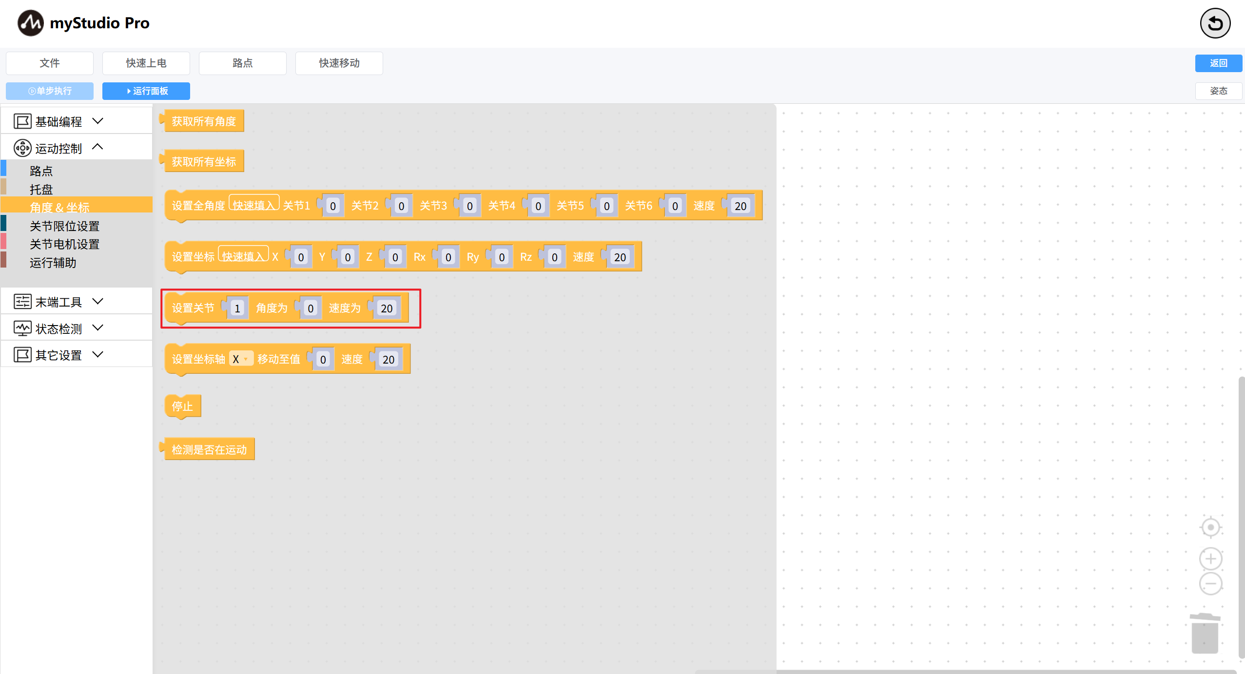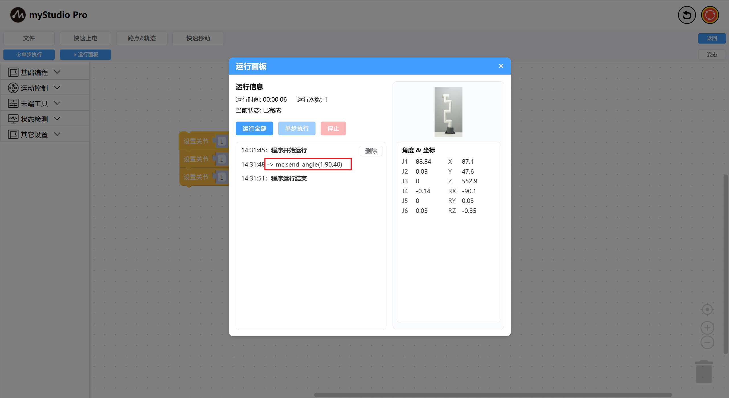 第三步: 点击 单步执行 按钮,会自动打开运行面板,并开始执行代码。同时,观察机械臂运动变化。(单步执行设置关节1为90°)