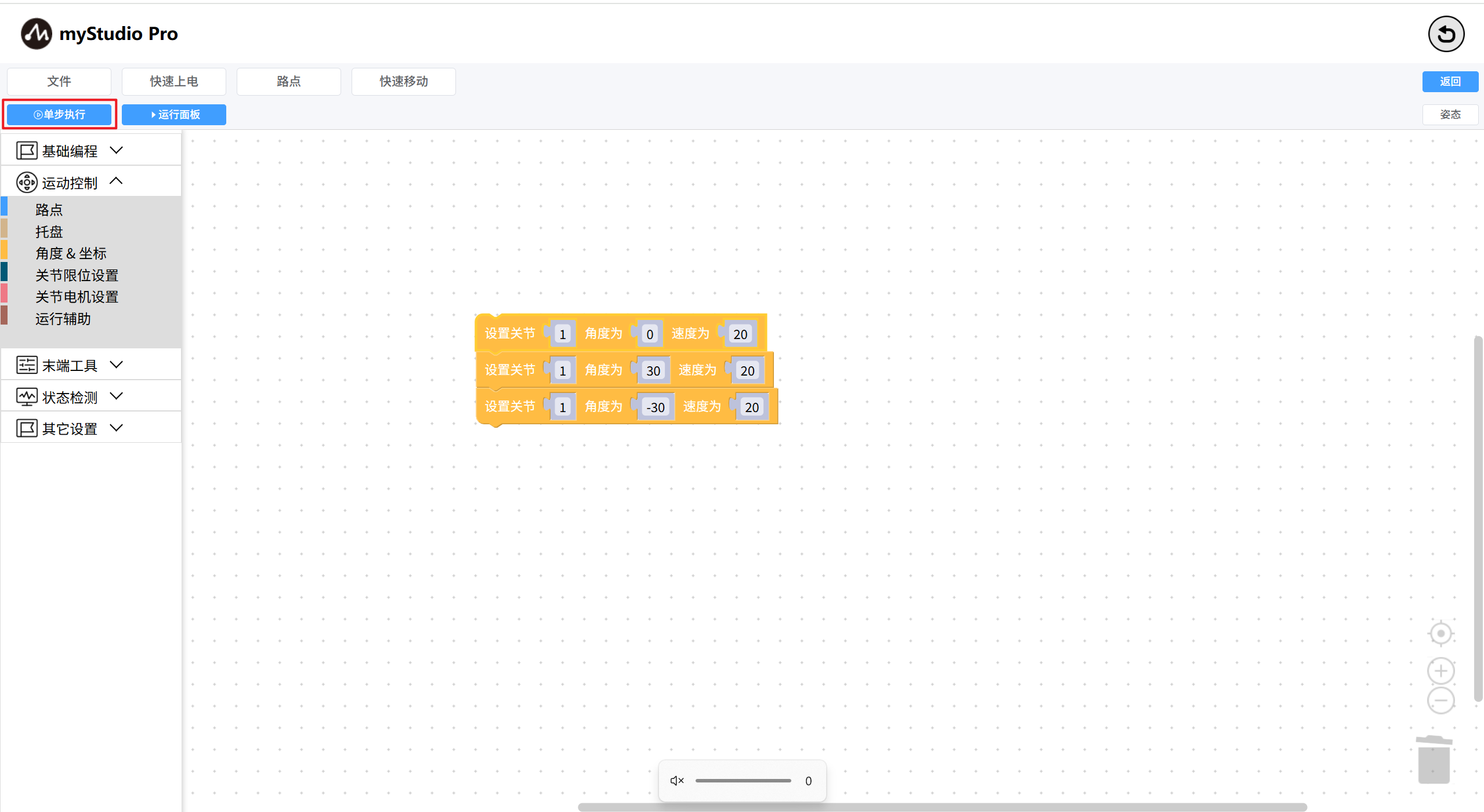 积木块,观察到 单步执行 按钮已被解锁(颜色变为了深色)