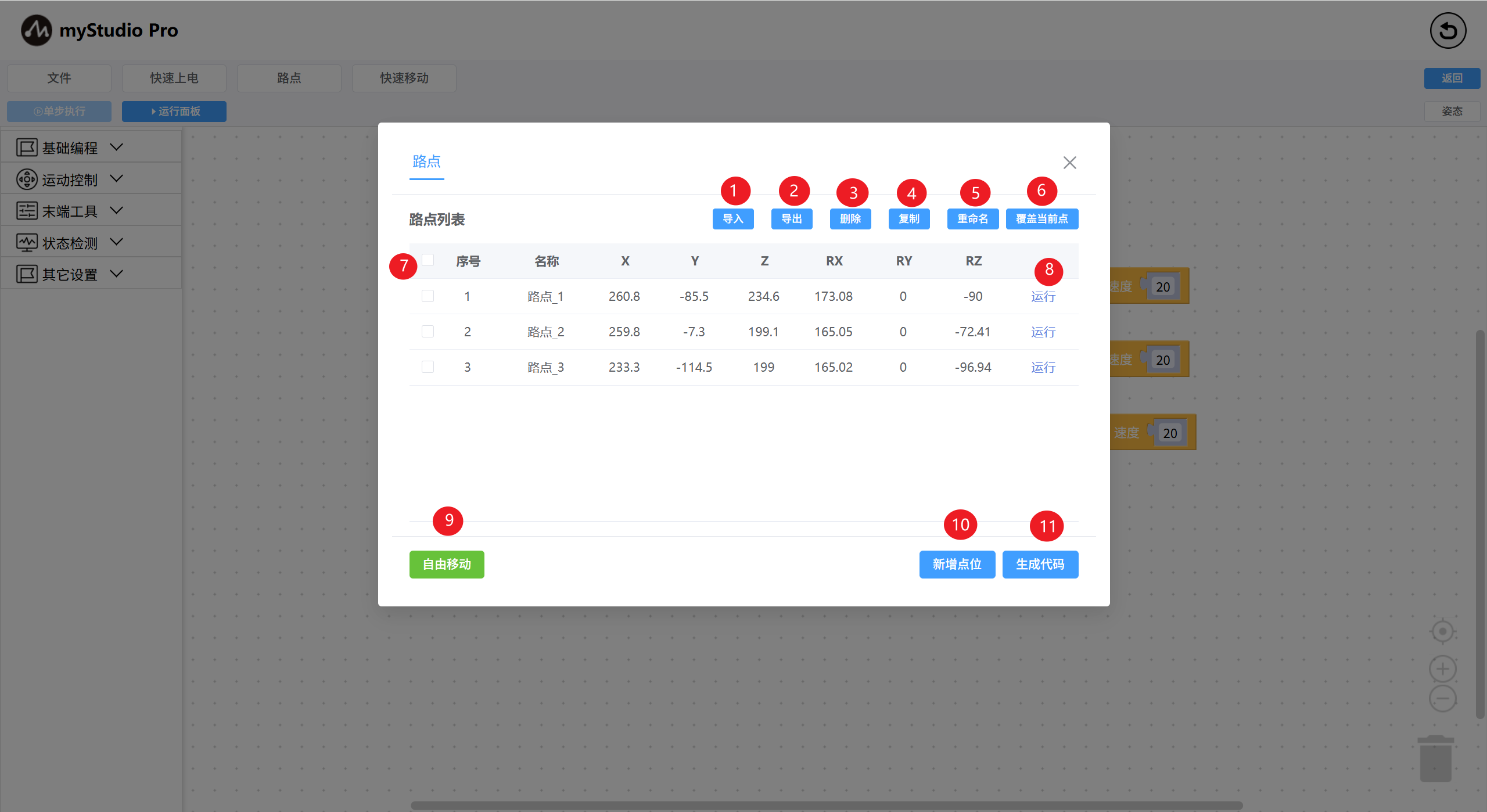 11 | 点击“生成代码”按钮会快速生成路点积木块到blockly程序编码区 |