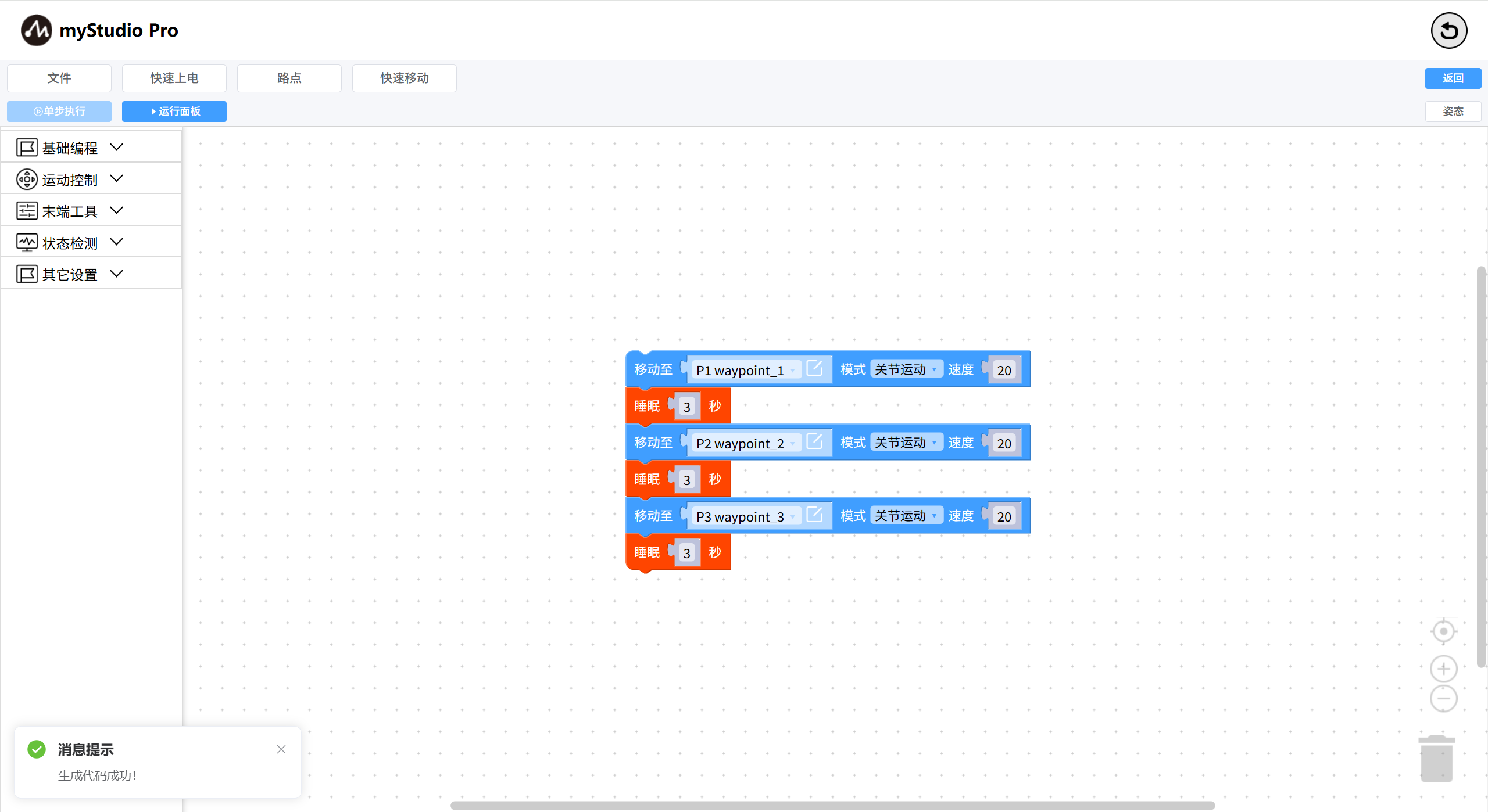中选择路点积木块,加入到程序编码区。或者使用路点列表中的生成代码