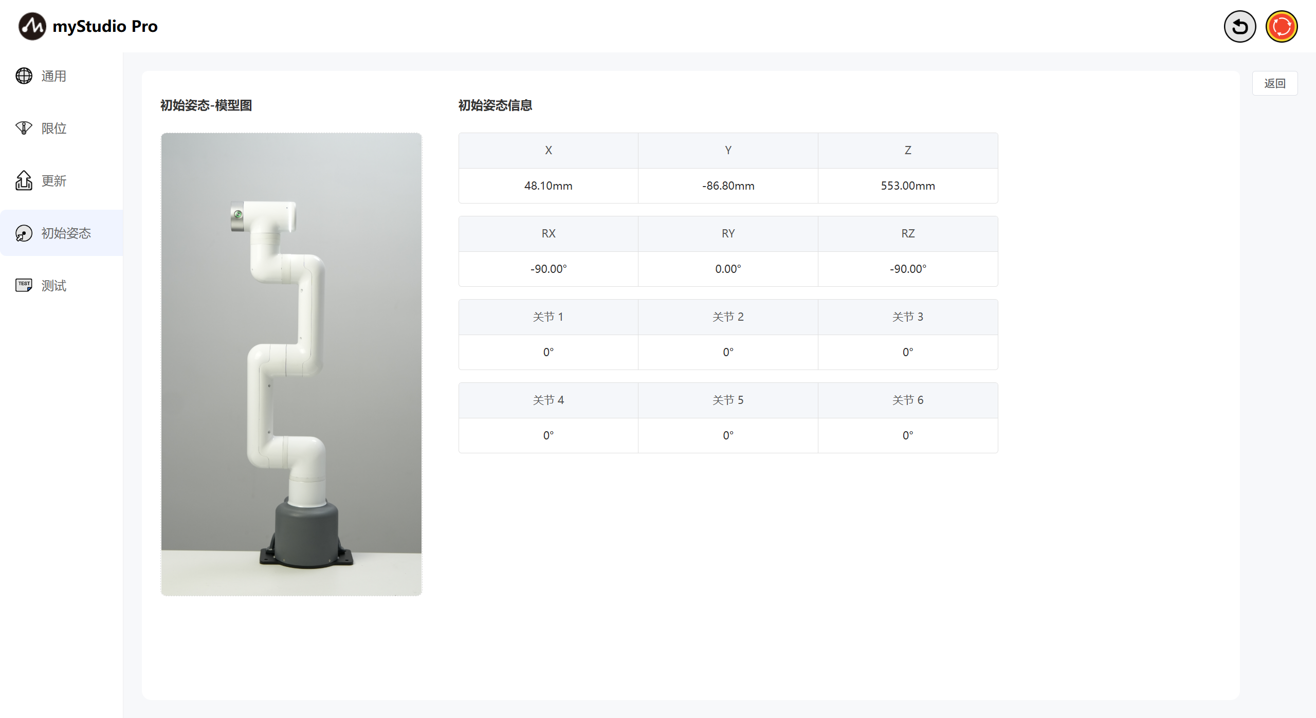 初始姿态页面:显示机械臂的初始姿态模型图、关节角度信息和坐标姿态信息。
