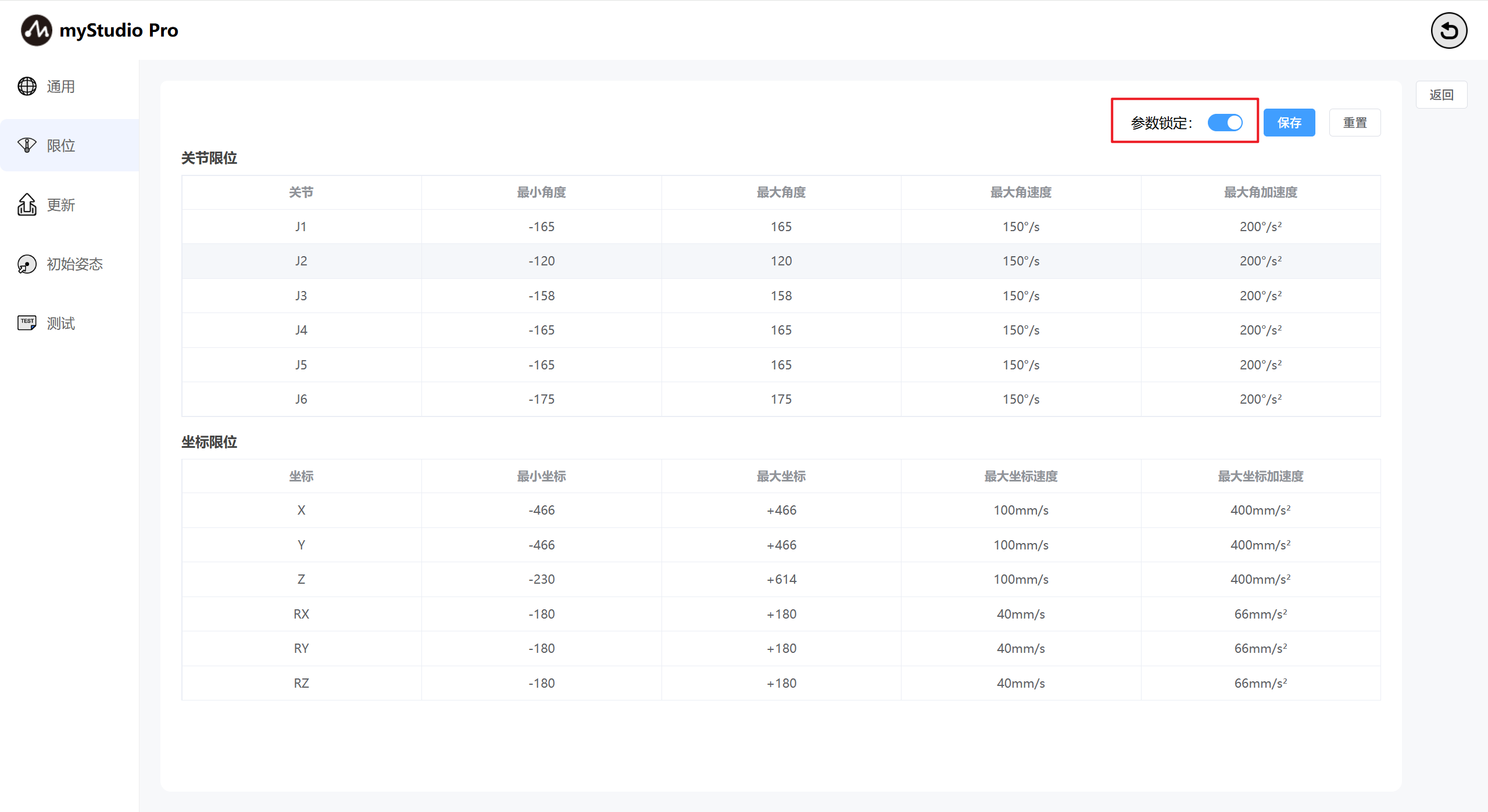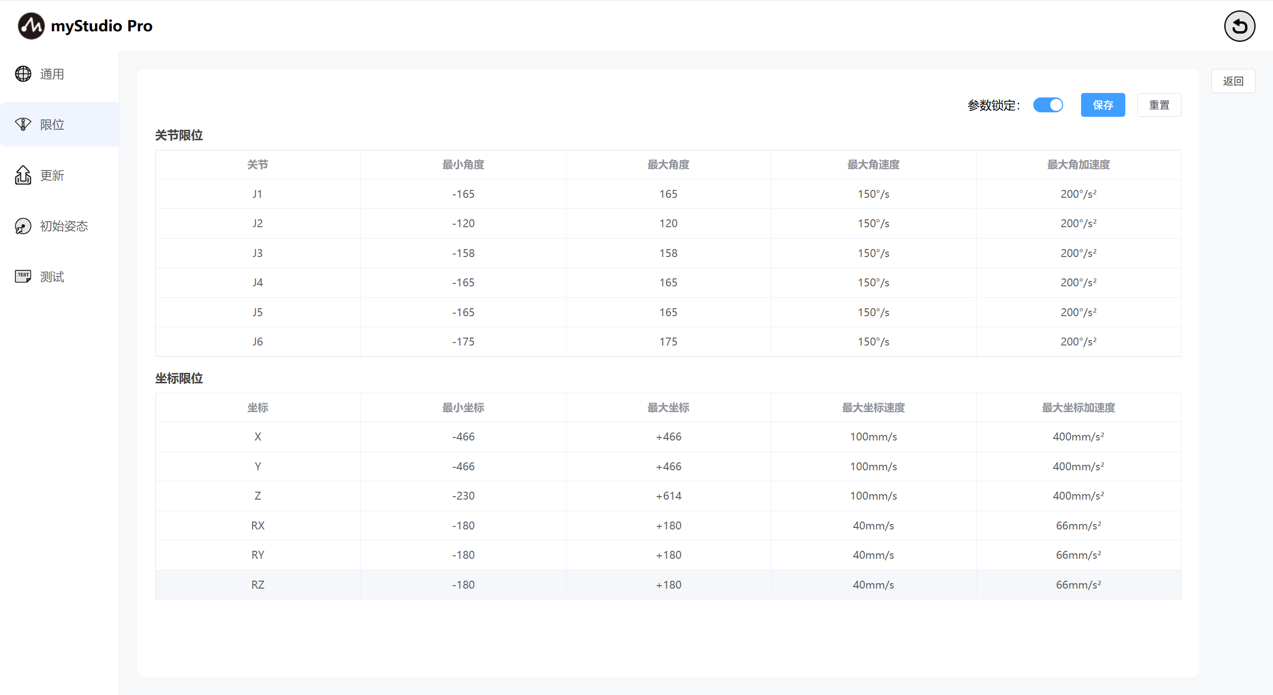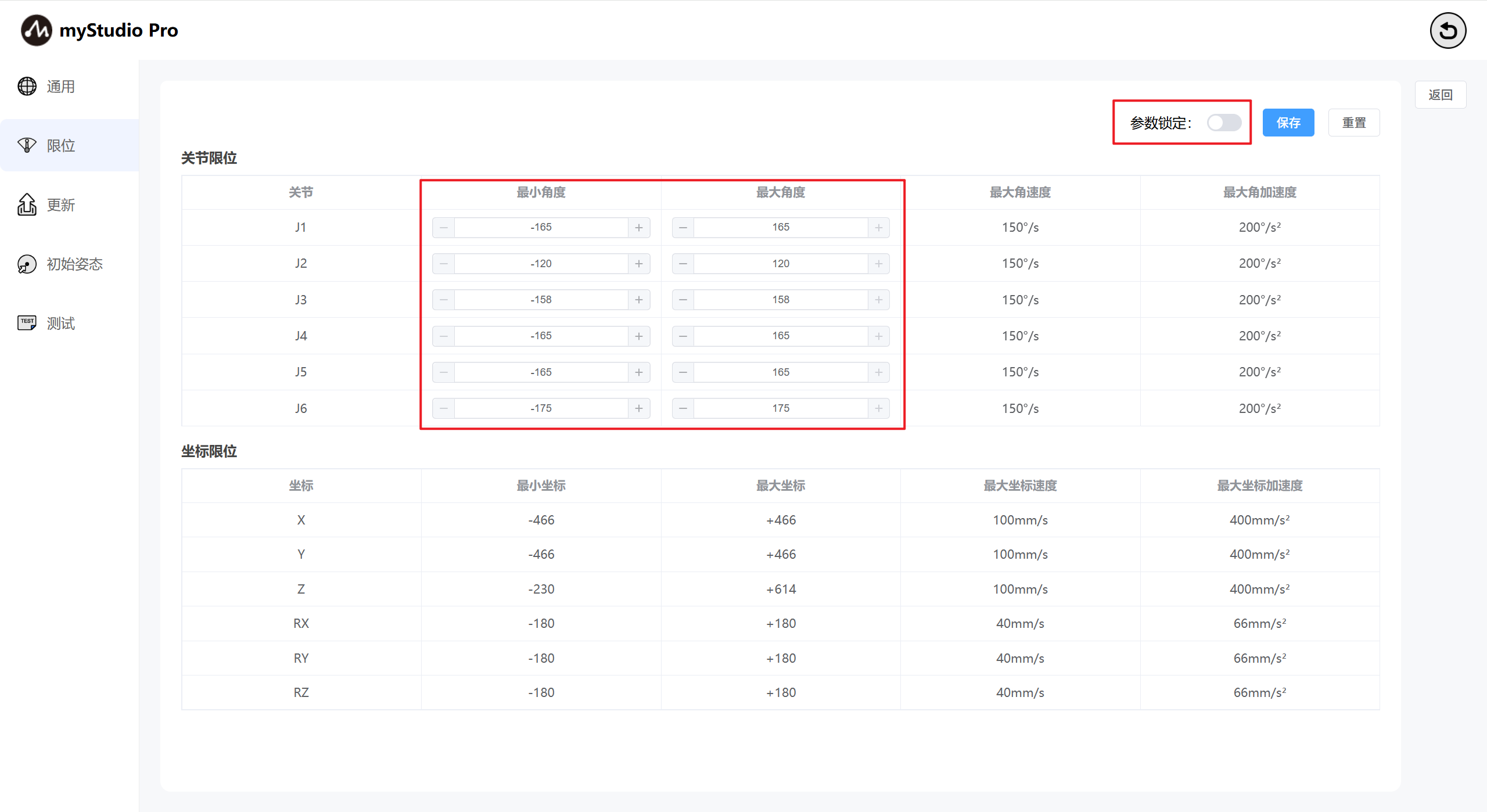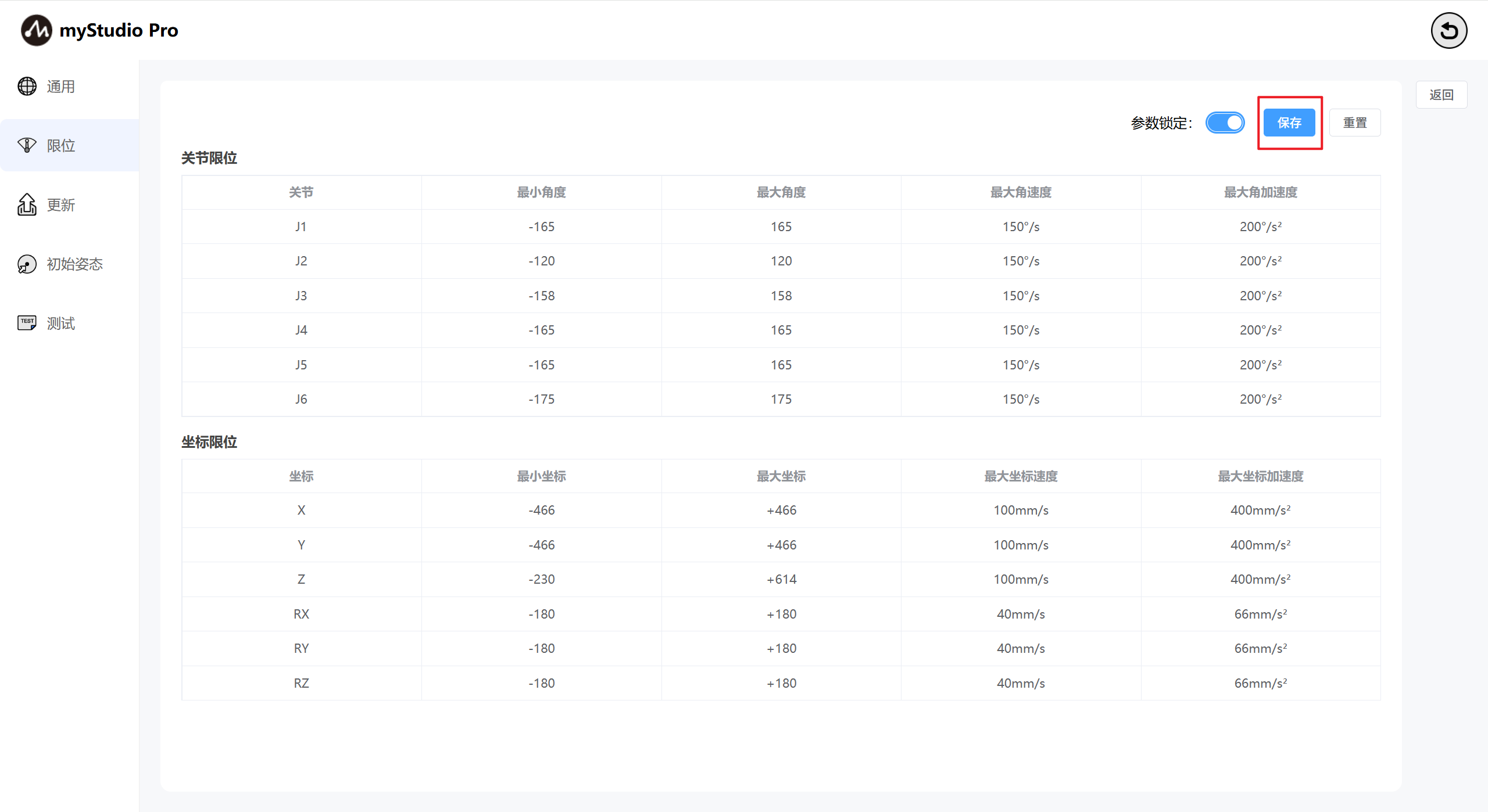 界面默认显示当前机械臂的关节限位和坐标限位的相关参数。