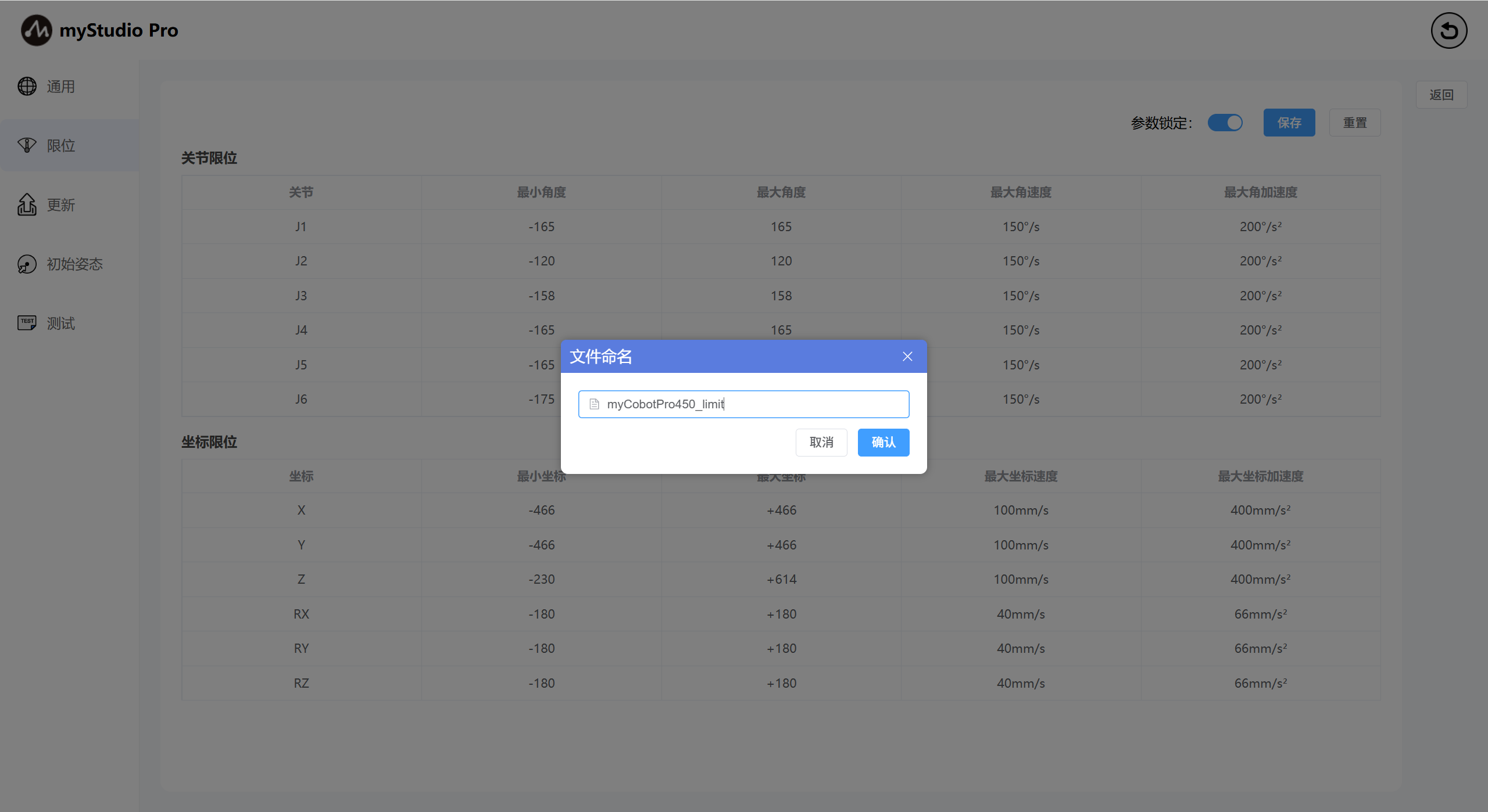 按钮,根据弹窗的提示定义文件名,即可将当前限位页面的参数保存到本地文件(json文件),并且设置机械臂的关节限位。