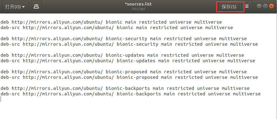 - 配置完成后,sources.list 文件内容如下所示,点击保存并退出。