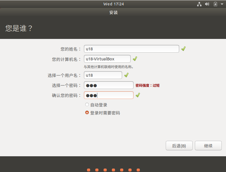 设置用户名和密码,点击“继续”按钮;