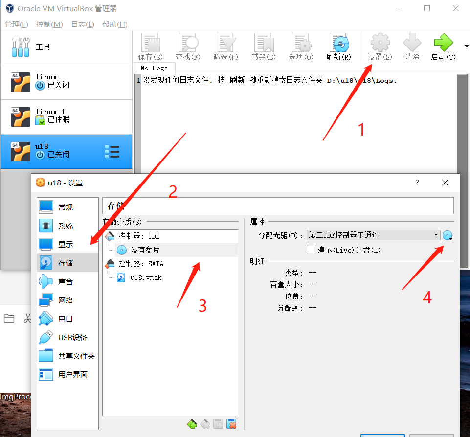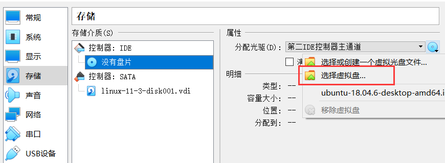 在 Virtual box 中找到之前安装的虚拟机,进入设置,并在存储中给控制器分配光盘: