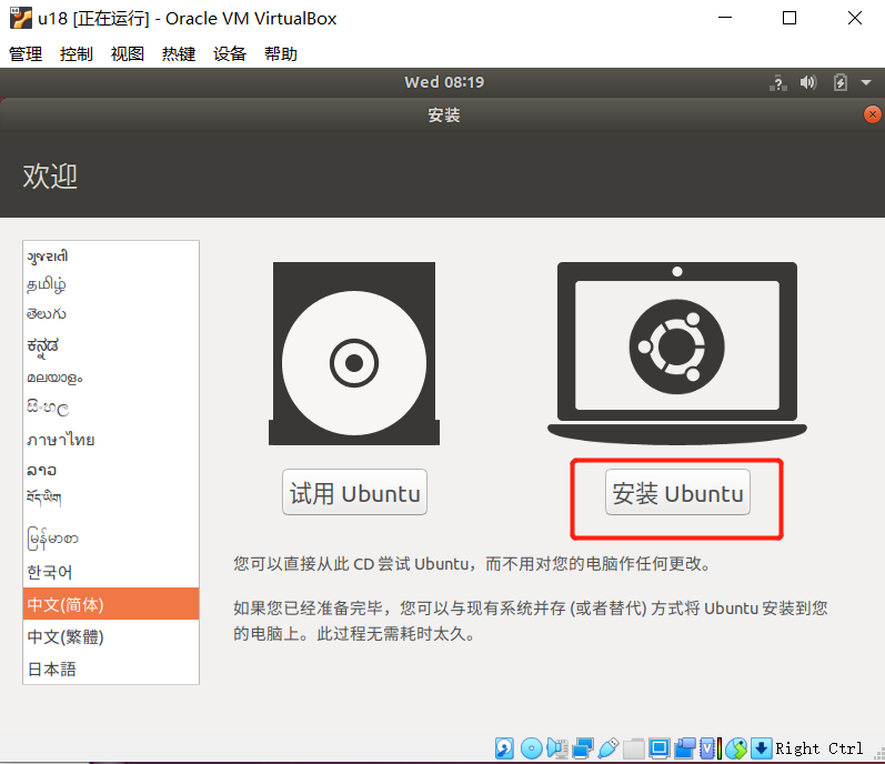 等待系统启动,进入欢迎界面,选中“中文(简体)”,并点击“安装 Ubuntu”按钮;