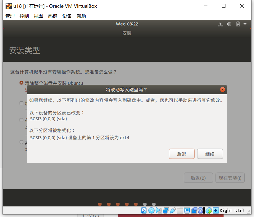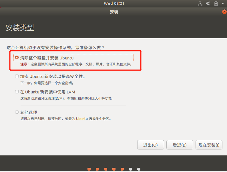 选中“清除整个磁盘并安装 Ubuntu”选项,点击“现在安装”按钮;