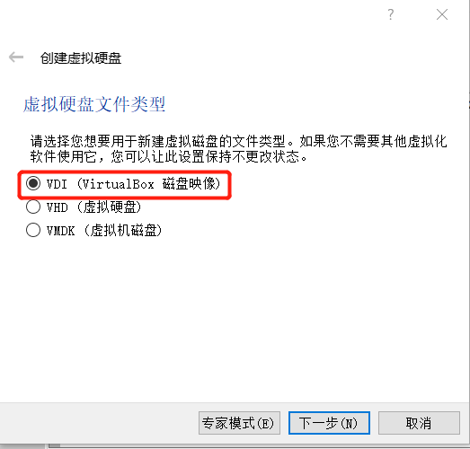 虚拟硬盘类型选择VDI类型,进行下一步。