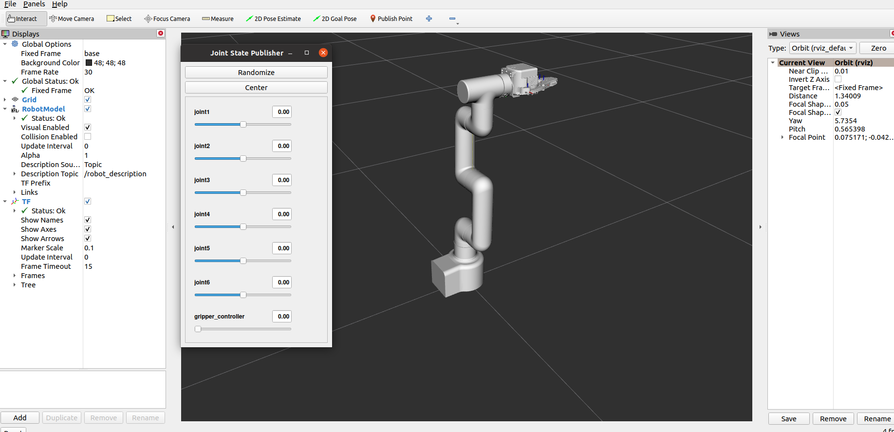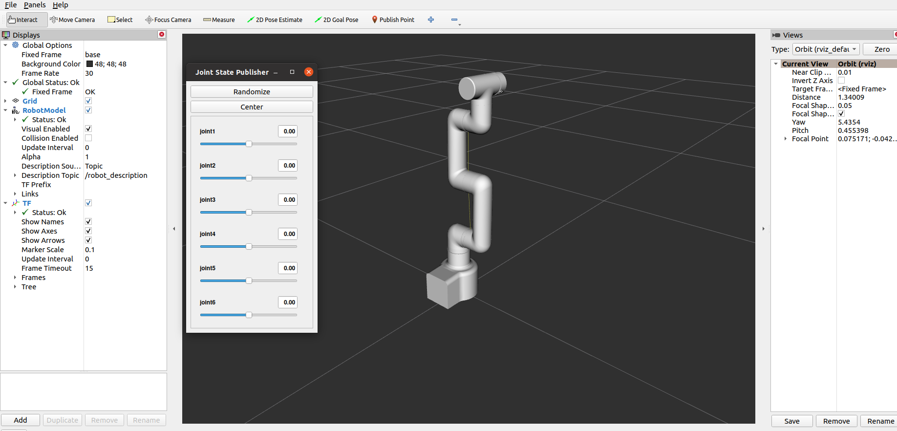 运行成功后,机械臂所有关节处于释放状态。它将打开 rviz 以显示模型跟随效果 。此时拖动真实机械臂关节,仿真模型将会跟随真实机械臂运动。