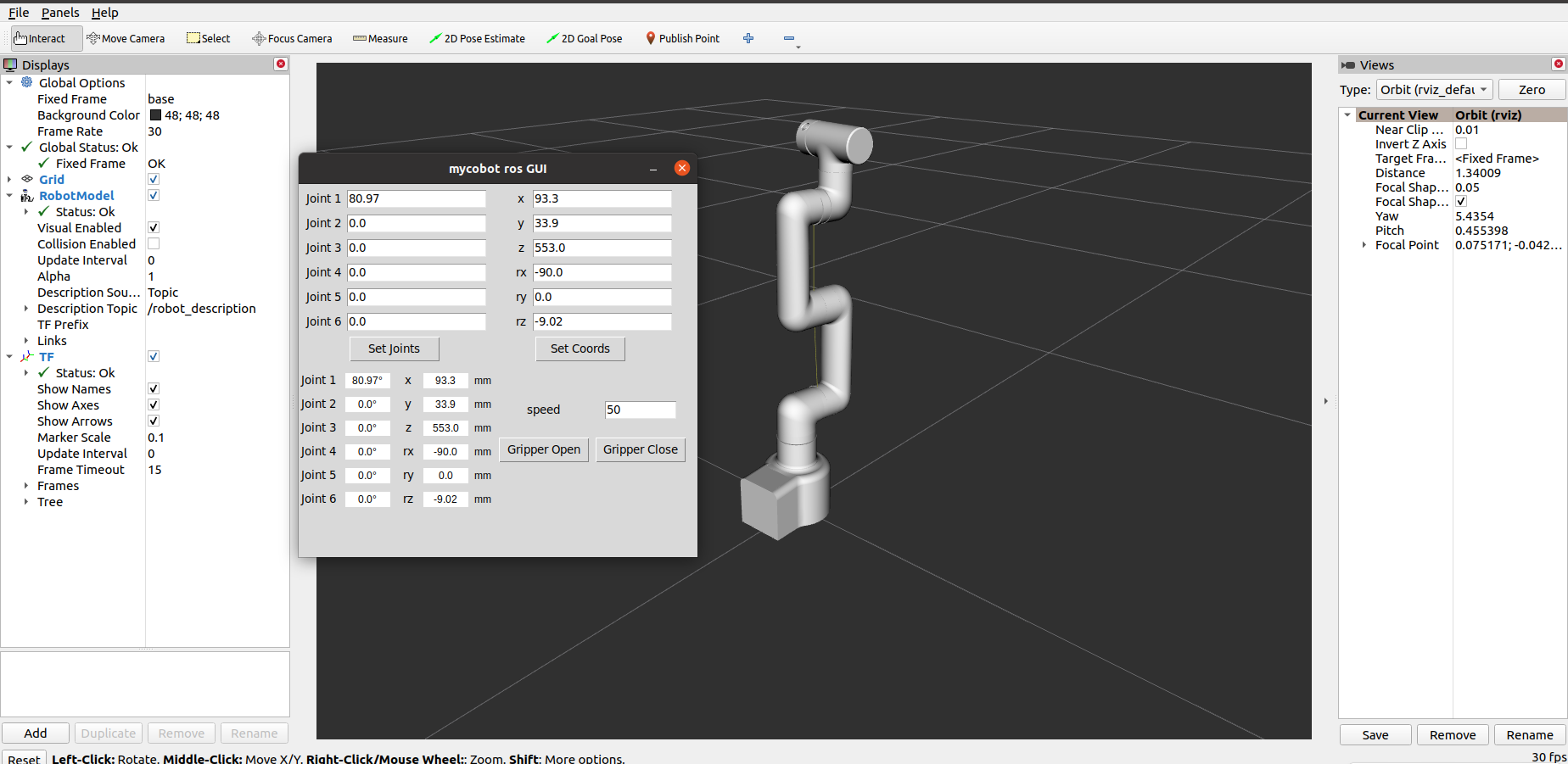 然后,您可以在 rviz2 中通过拖动滑块来控制模型的移动。真实的 mycobot 机器人也会随之移动。