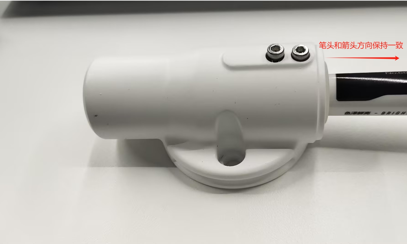 - 将两颗短螺丝伸入夹持器孔位中,将笔固定住,注意笔头朝向: