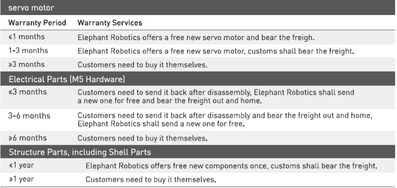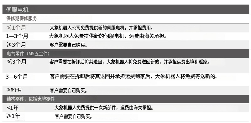 A: Our machines only provide the overall information of the entire joint, and do not provide the internal torque, voltage and current of the servo and motor actuator. The overall parameters of the robot arm are disclosed, such as repeatability, power supply voltage, etc.