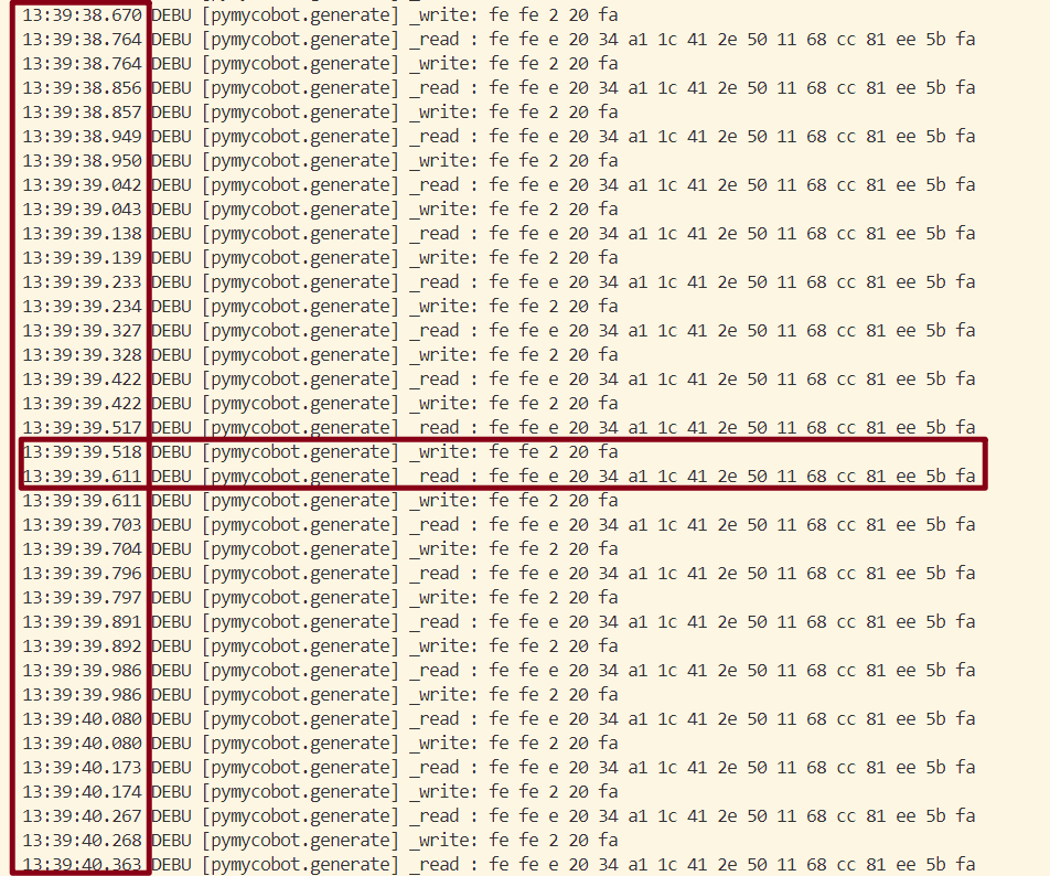 Write indicates the acquisition command sent, read indicates the returned message, and the left side indicates the time. Here, 518write + 611read are displayed, indicating that a get_angles read was completed in about 100ms, with a frequency of 10hz.