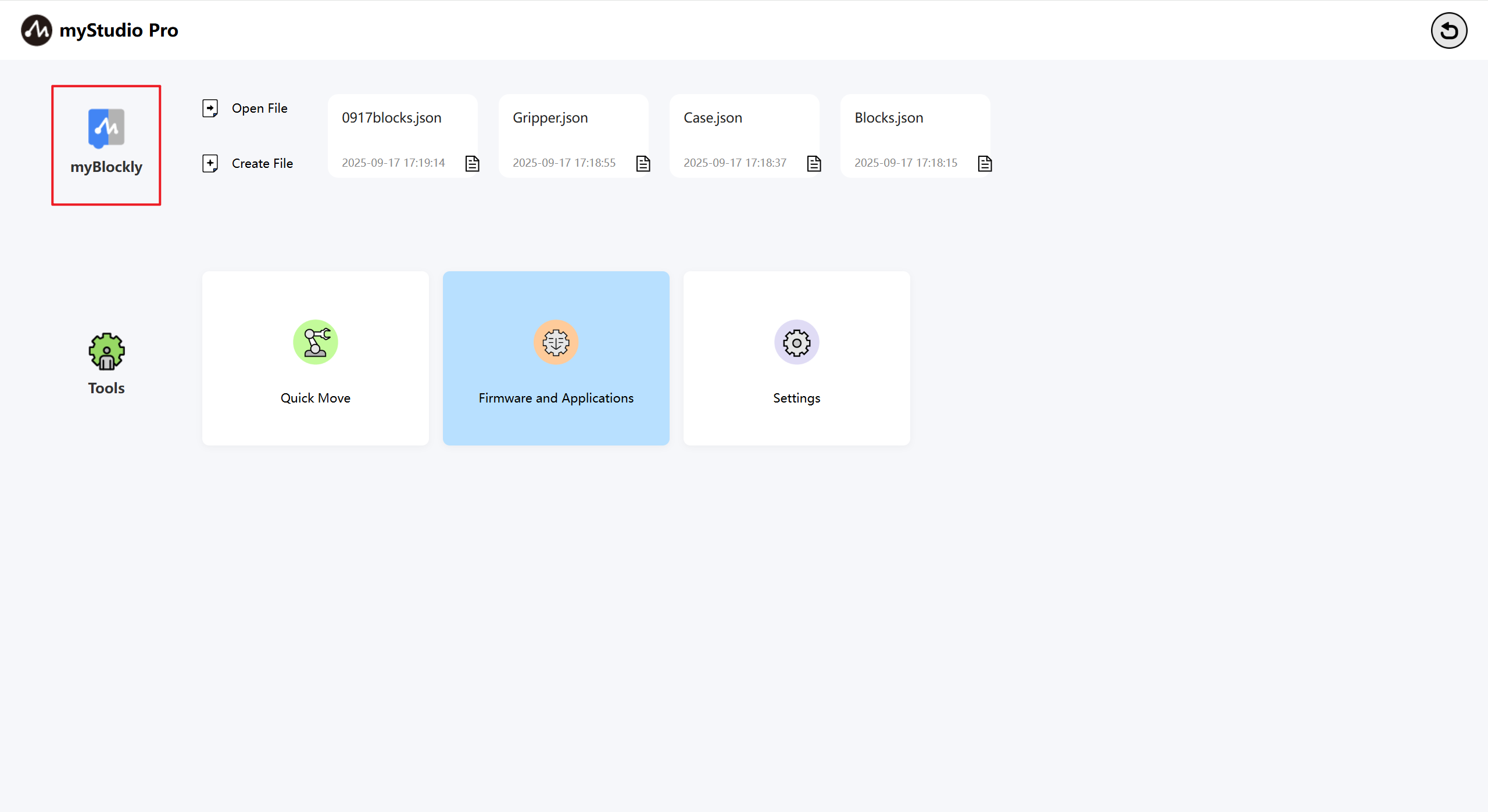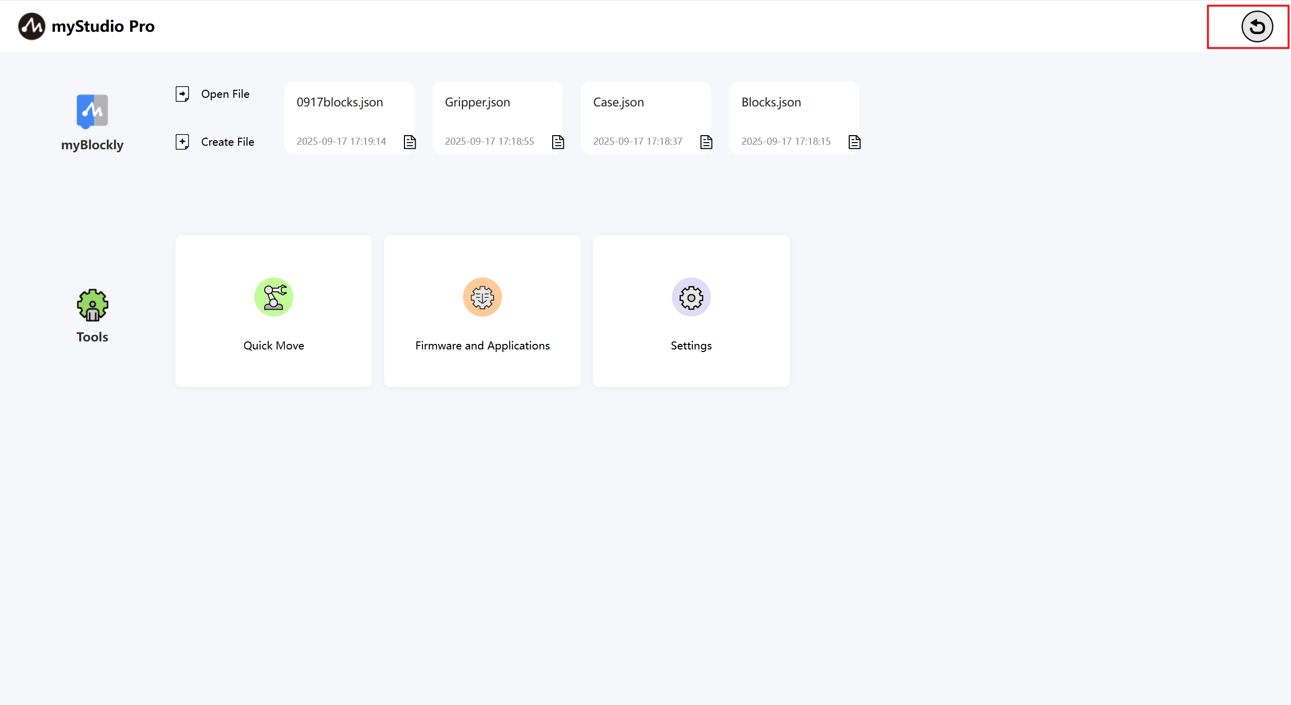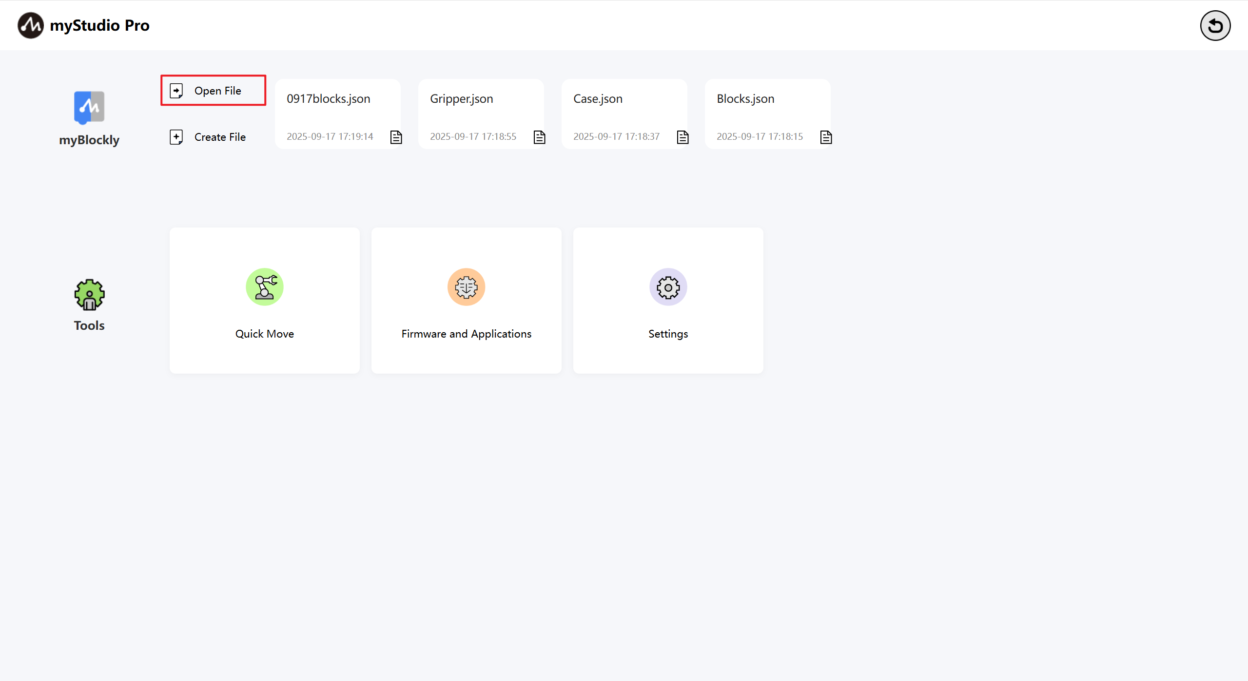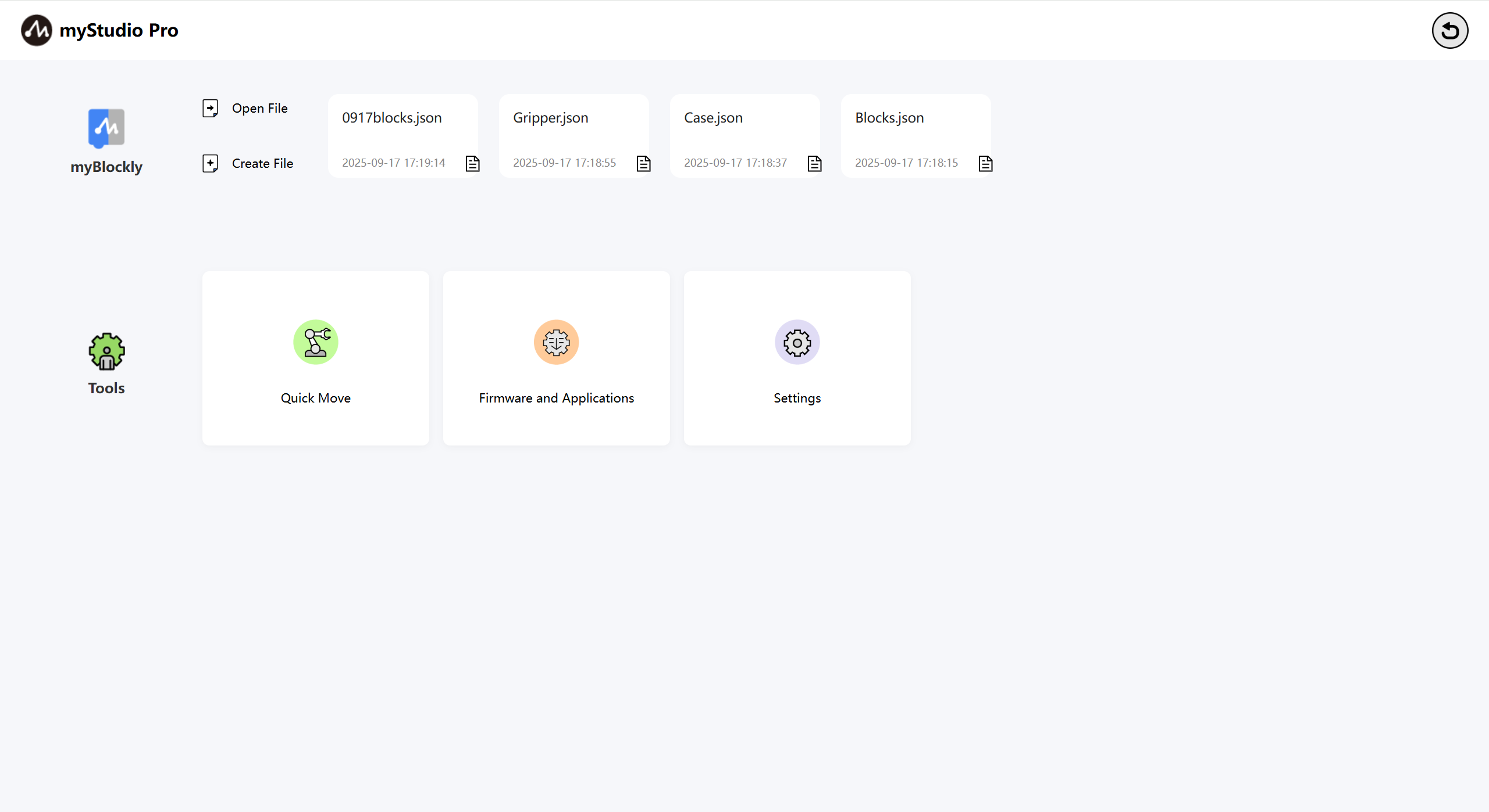 If you have used myBlockly to program and saved Blockly files, the saved file names and save times will be displayed as shown below. A maximum of four files will be displayed. If more than four files are saved, only the most recent four will be displayed. Left-clicking will open myBlockly and automatically load the selected Blockly file.