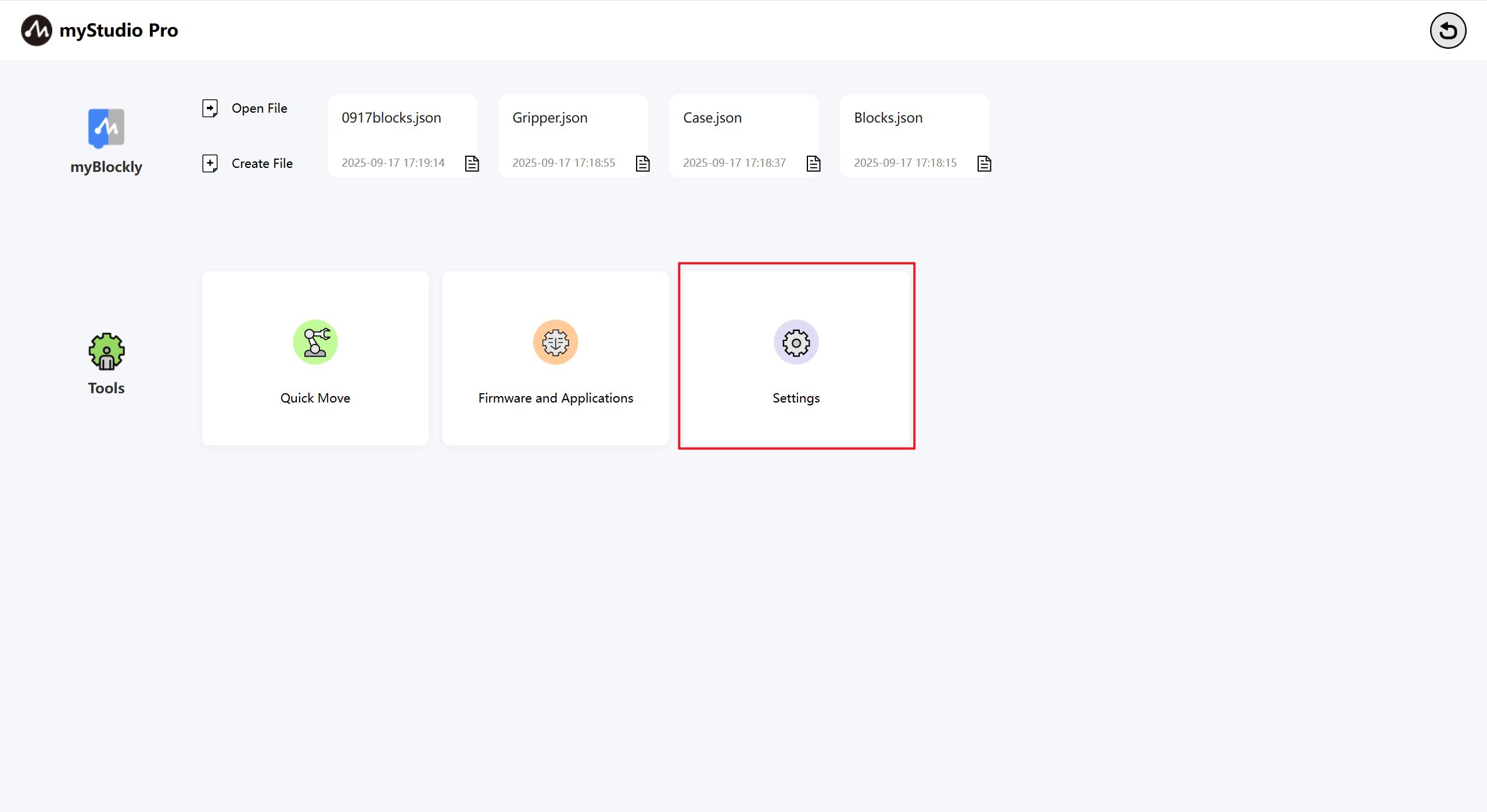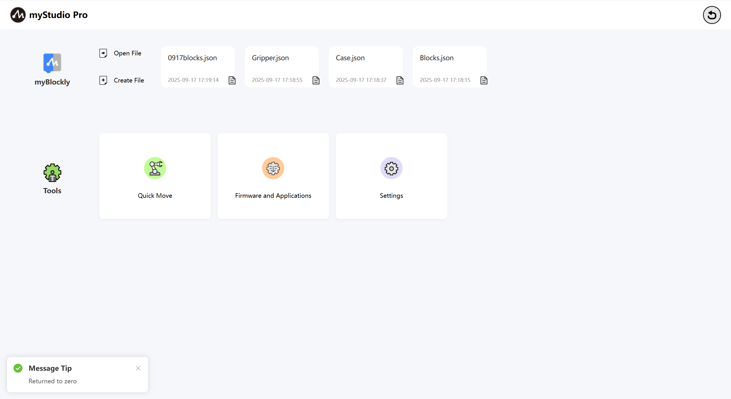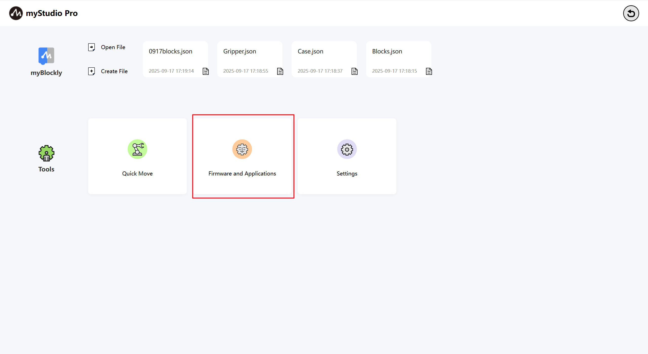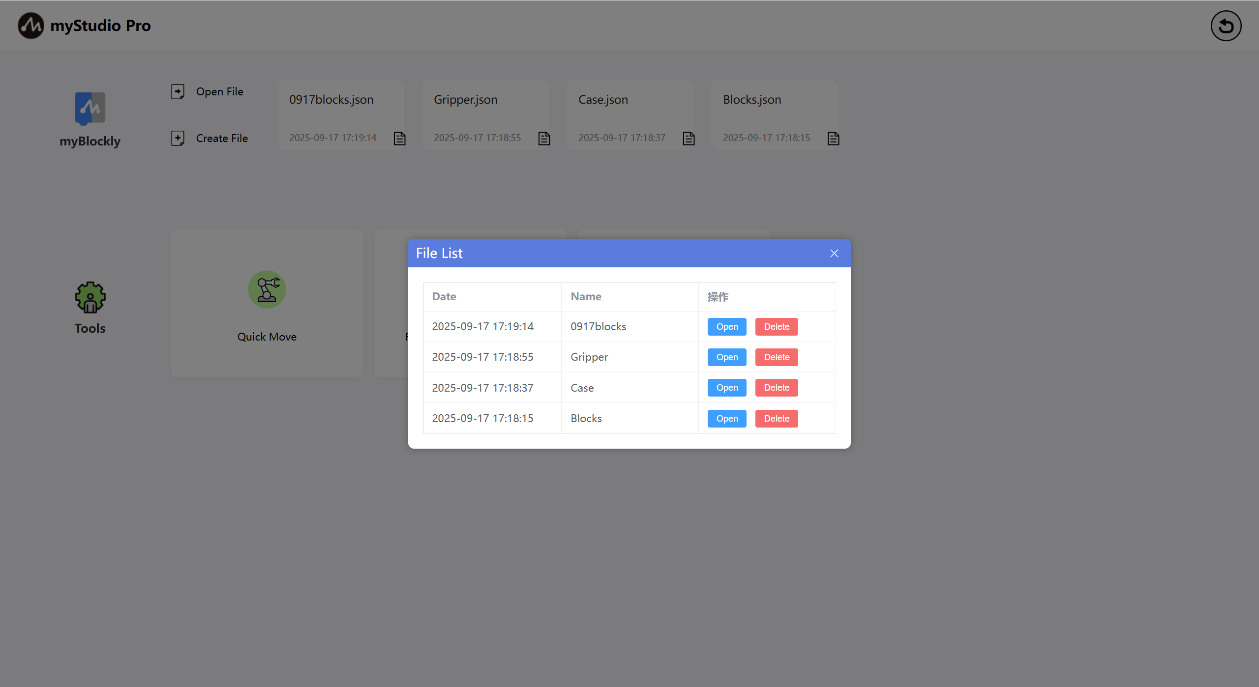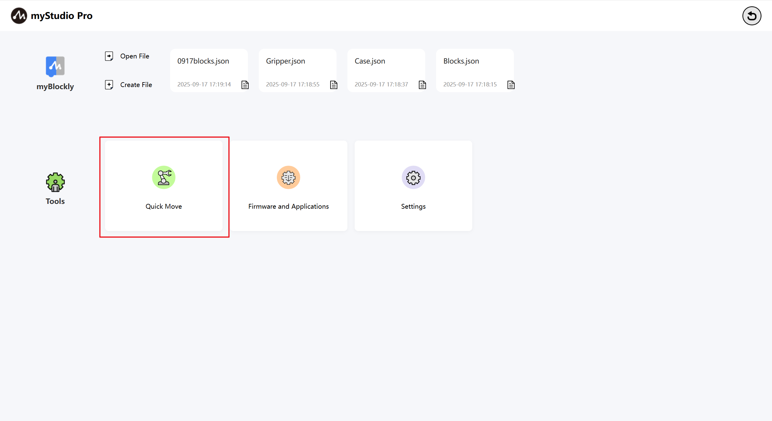 If you have used myBlockly to program and saved Blockly files, the saved file names and save times will be displayed as shown below. A maximum of four files will be displayed. If more than four files are saved, only the most recent four will be displayed. Left-clicking will open myBlockly and automatically load the selected Blockly file.