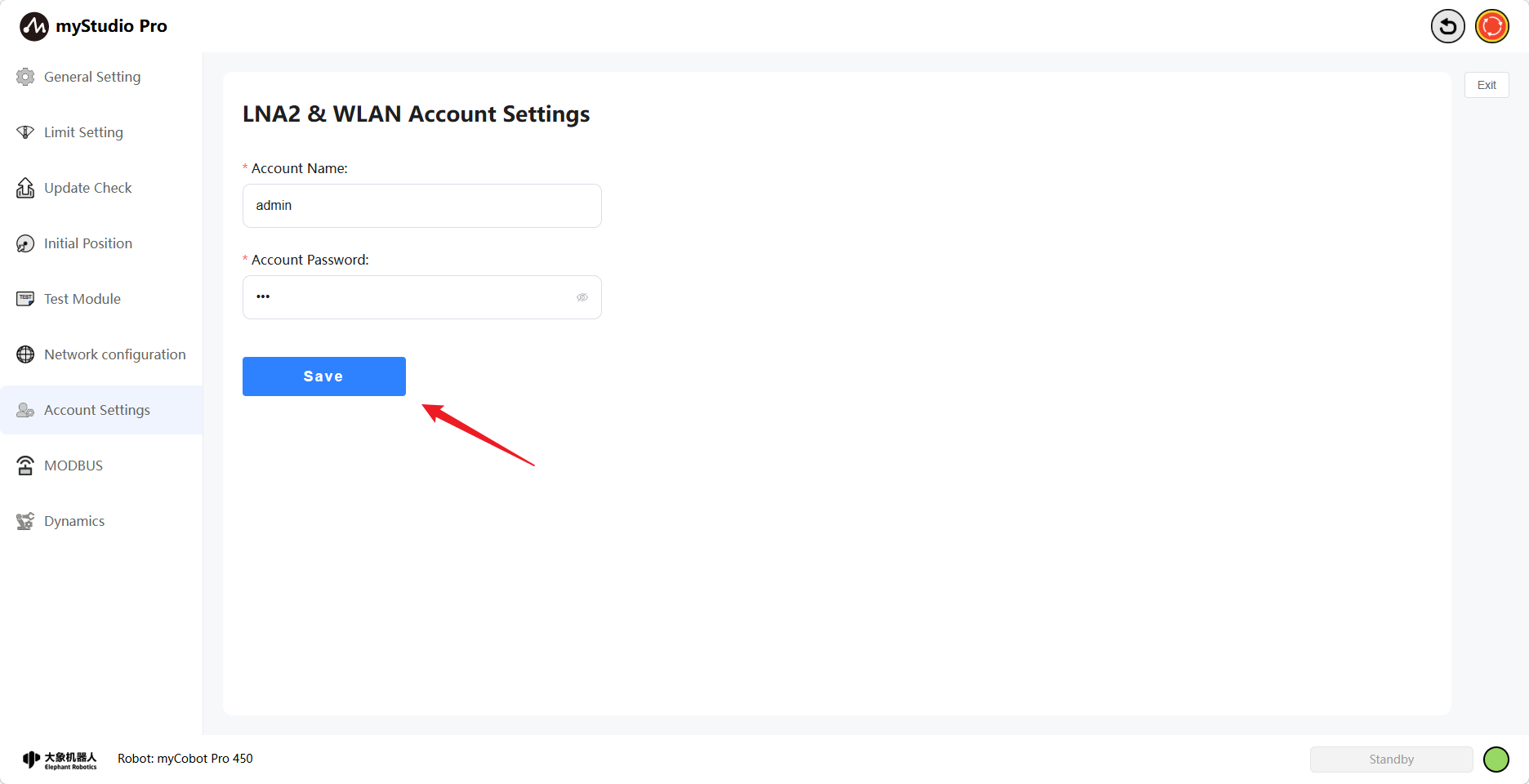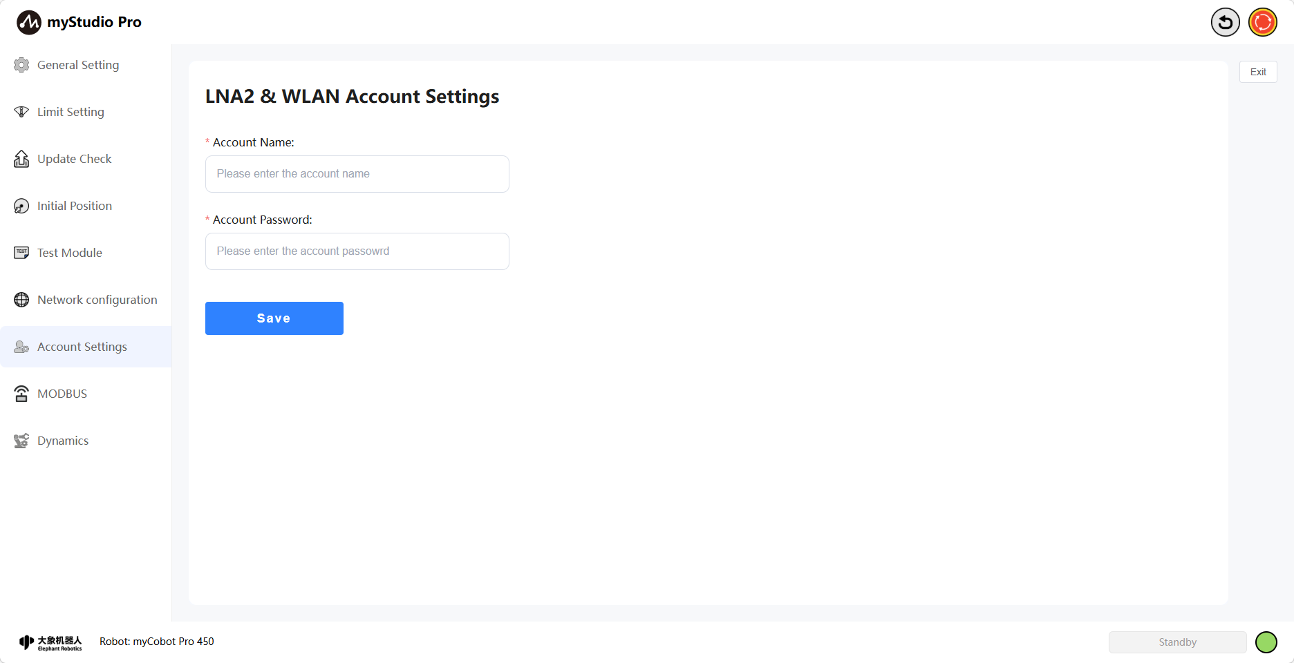 Clicking the Account Settings icon button will take you to the account settings page. This page is mainly used to set the username and password when logging into myStudio Pro using LAN2 or WLAN network ports. Once your username and password are successfully saved, you will use them to log in to myStudio Pro the next time. Otherwise, you will not be able to use myStudio Pro normally.