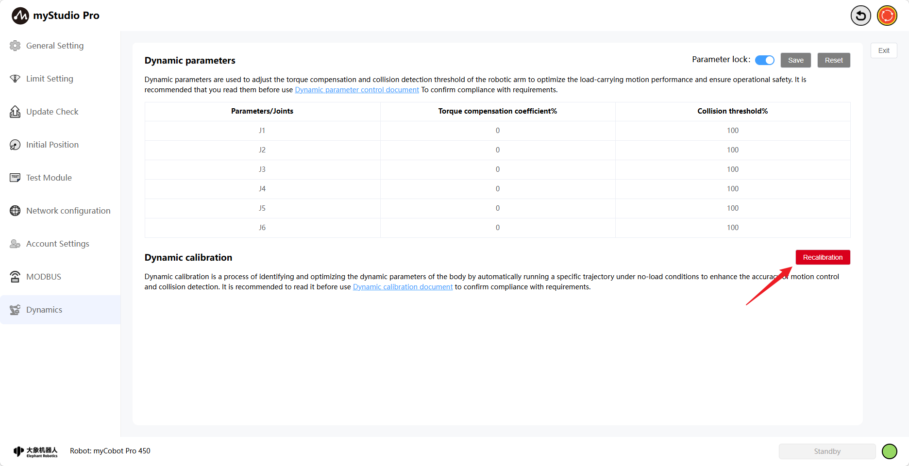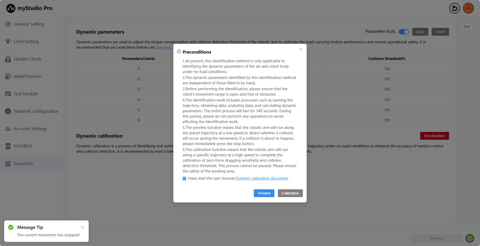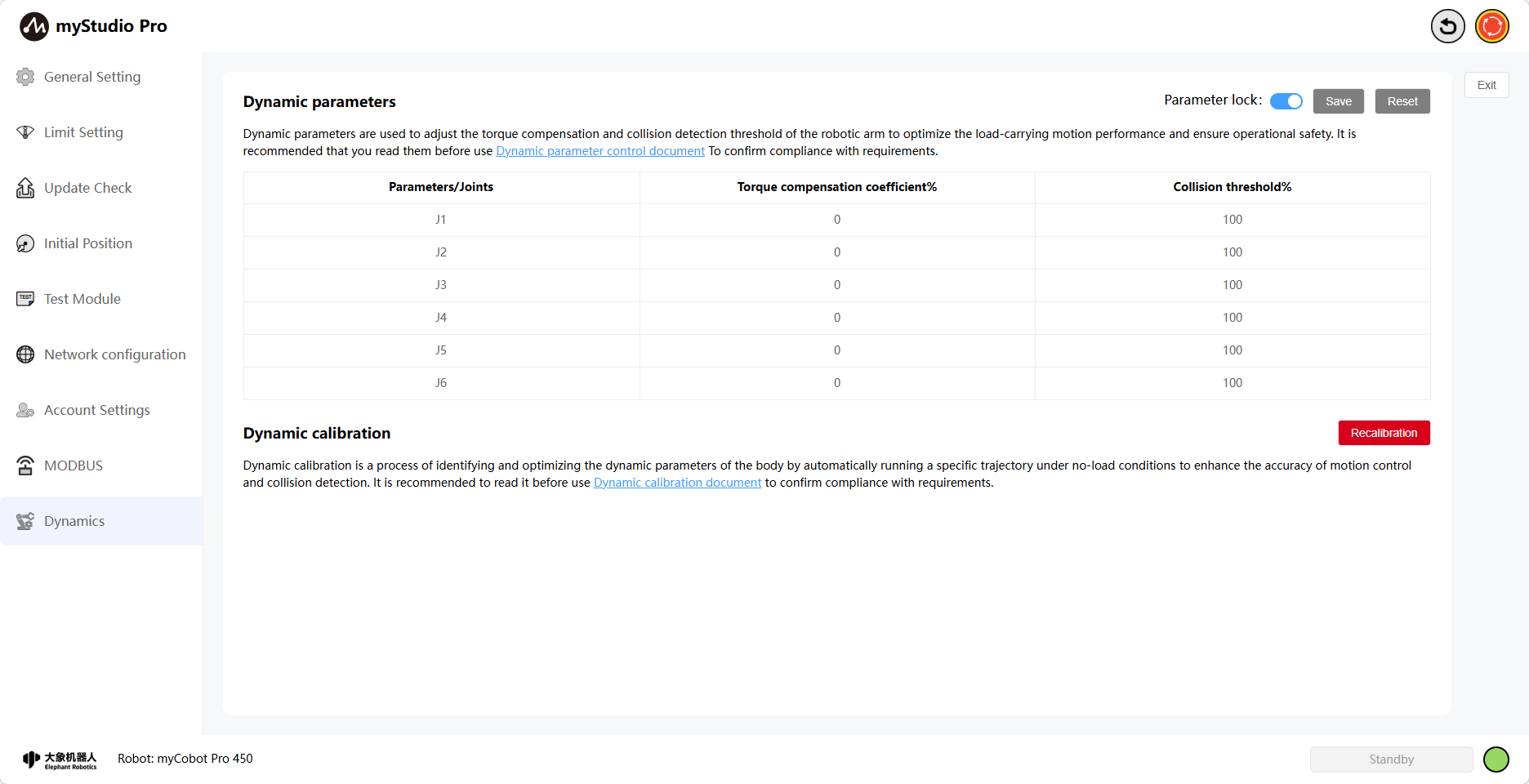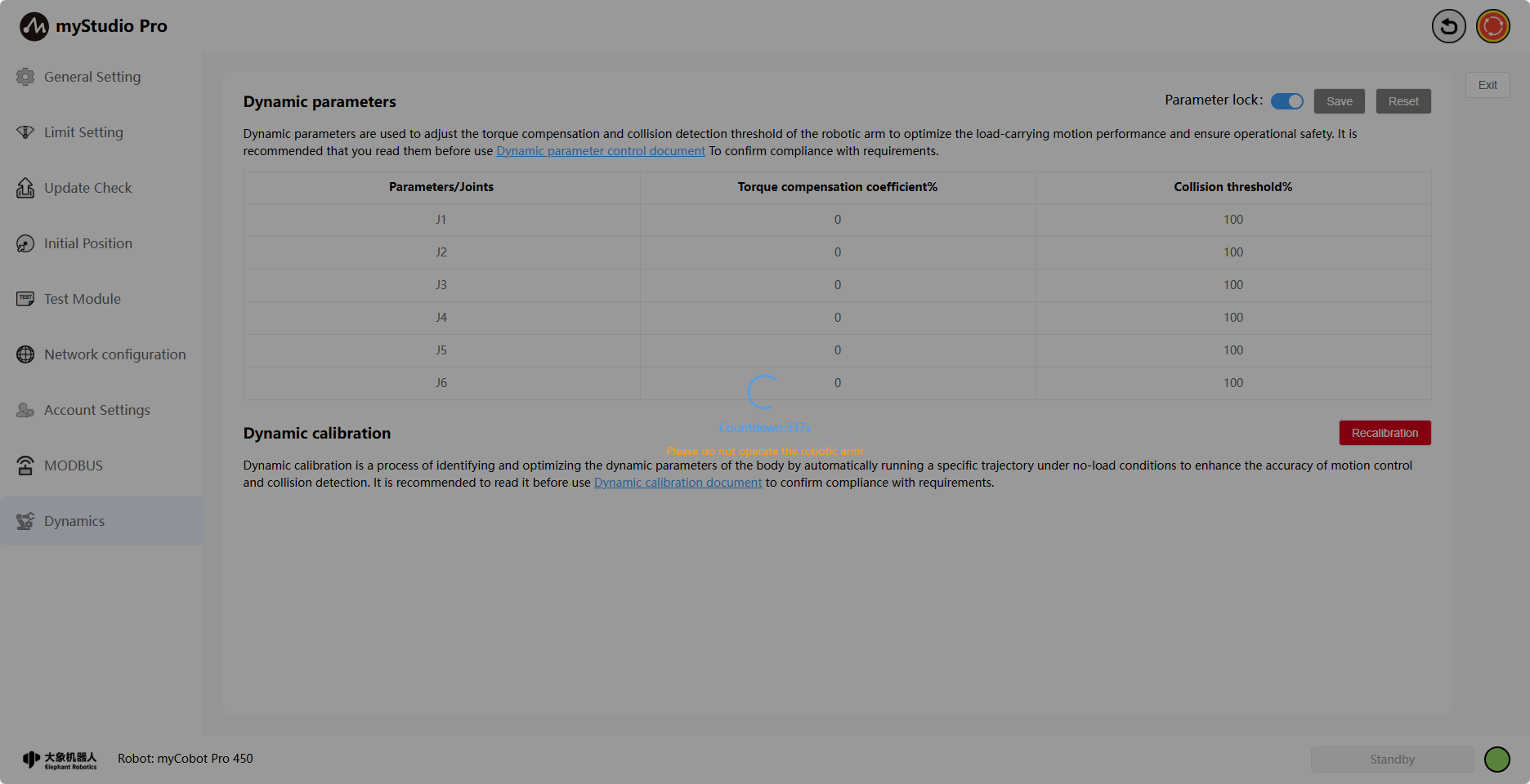Clicking the Dynamics icon will take you to the Dynamics page. This page is mainly used to set dynamic parameters, including torque compensation coefficients and collision threshold parameters. It also allows for trajectory preview and calibration, enabling optimization of body dynamic parameters to improve motion control accuracy and collision detection accuracy.