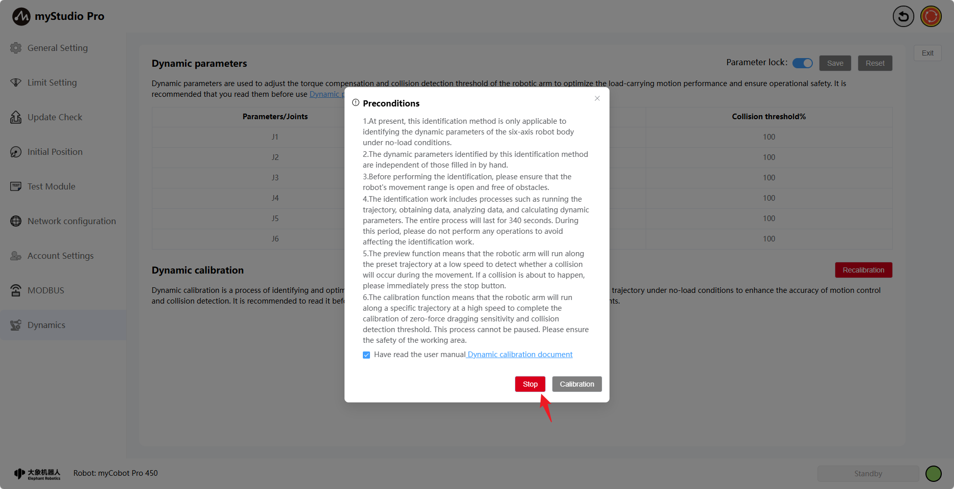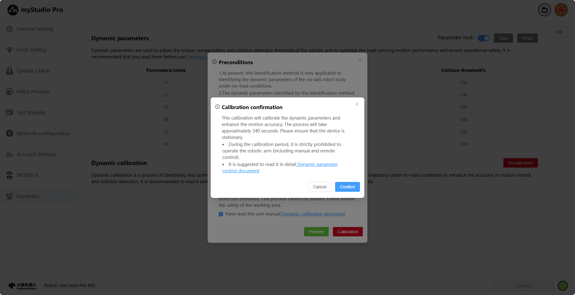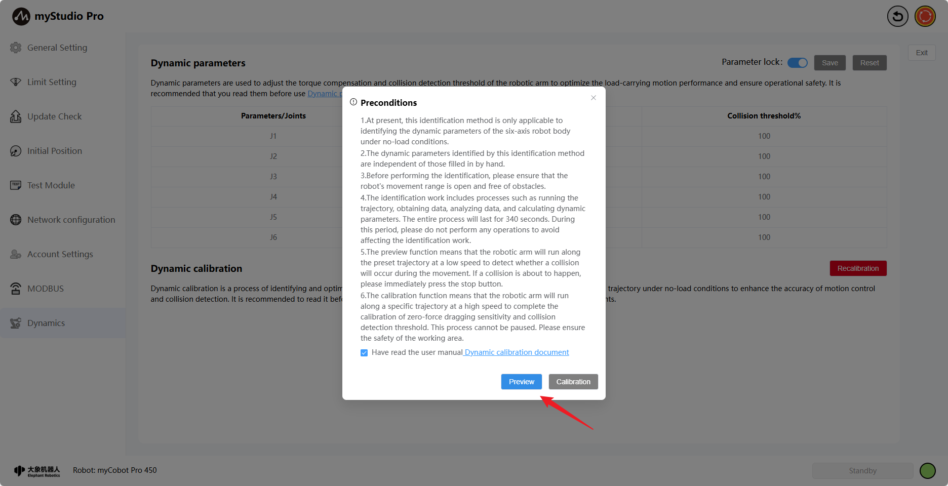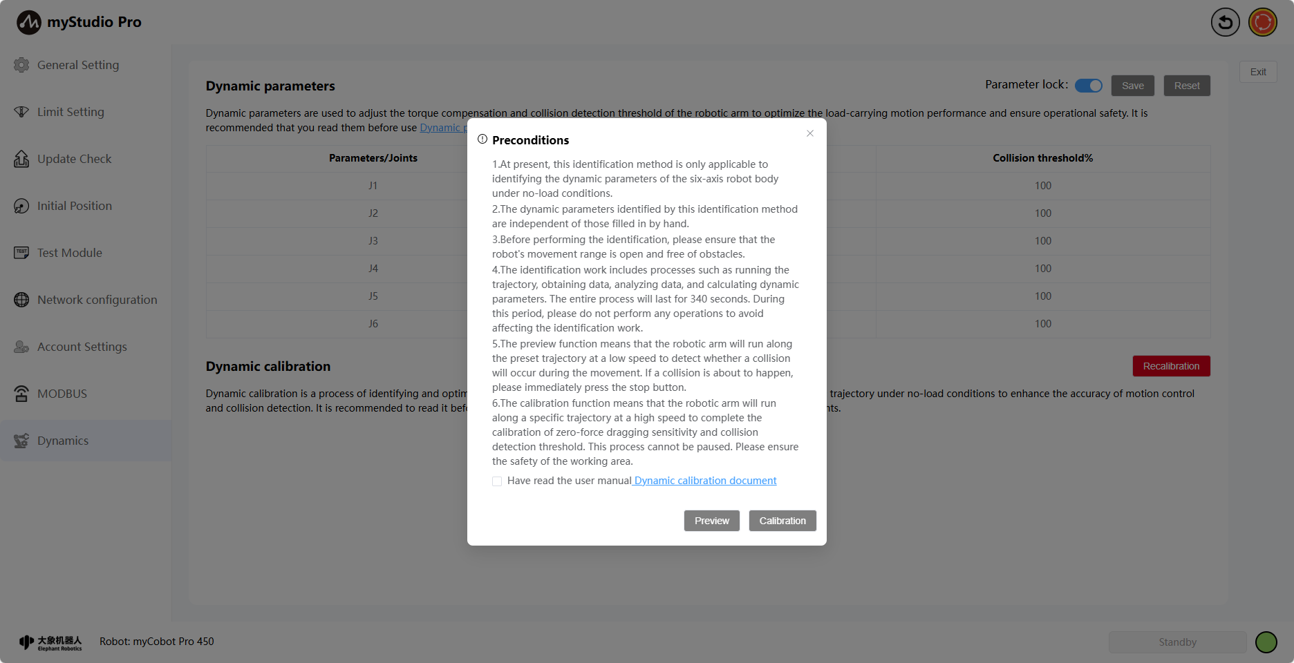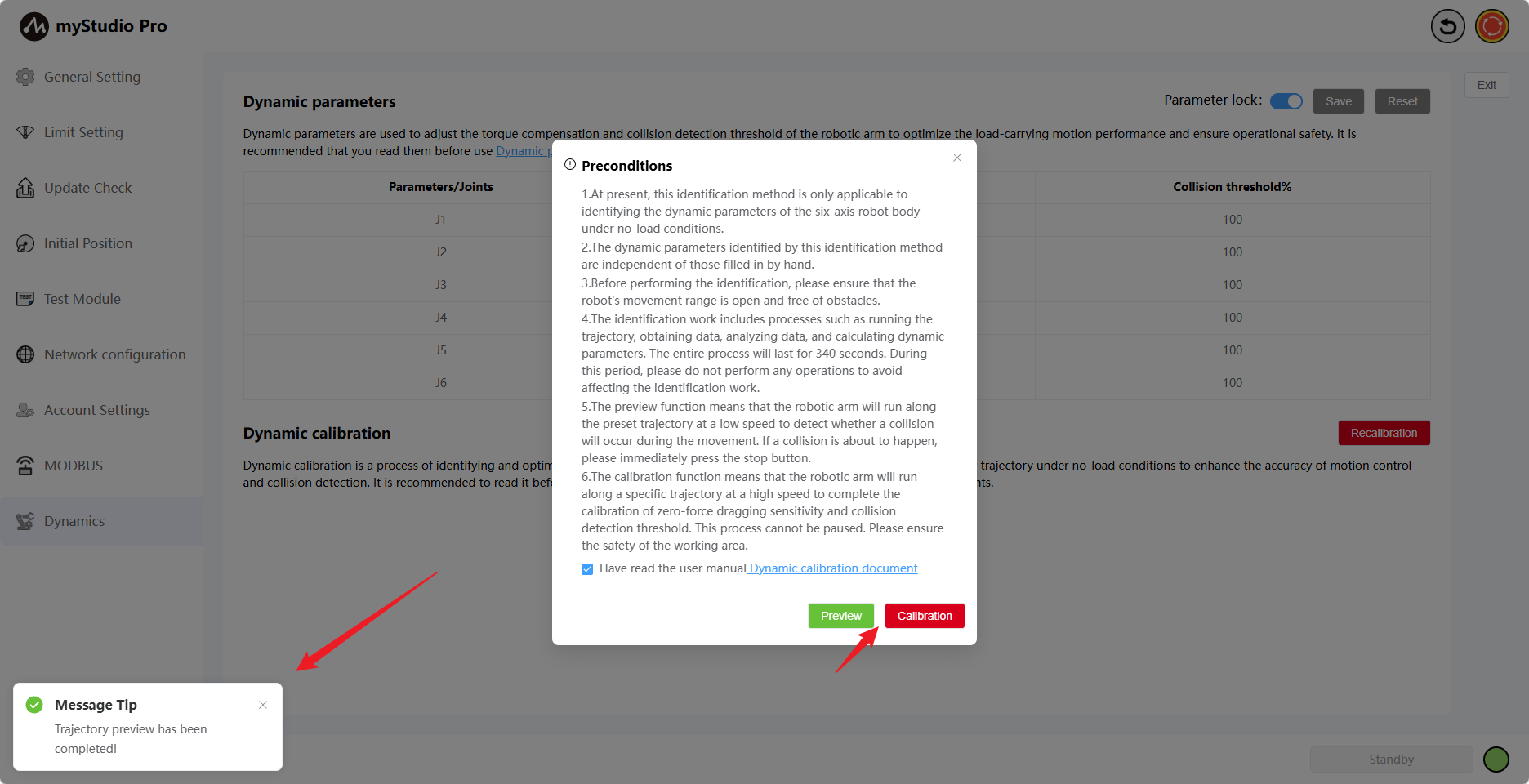 Clicking the Dynamics icon will take you to the Dynamics page. This page is mainly used to set dynamic parameters, including torque compensation coefficients and collision threshold parameters. It also allows for trajectory preview and calibration, enabling optimization of body dynamic parameters to improve motion control accuracy and collision detection accuracy.