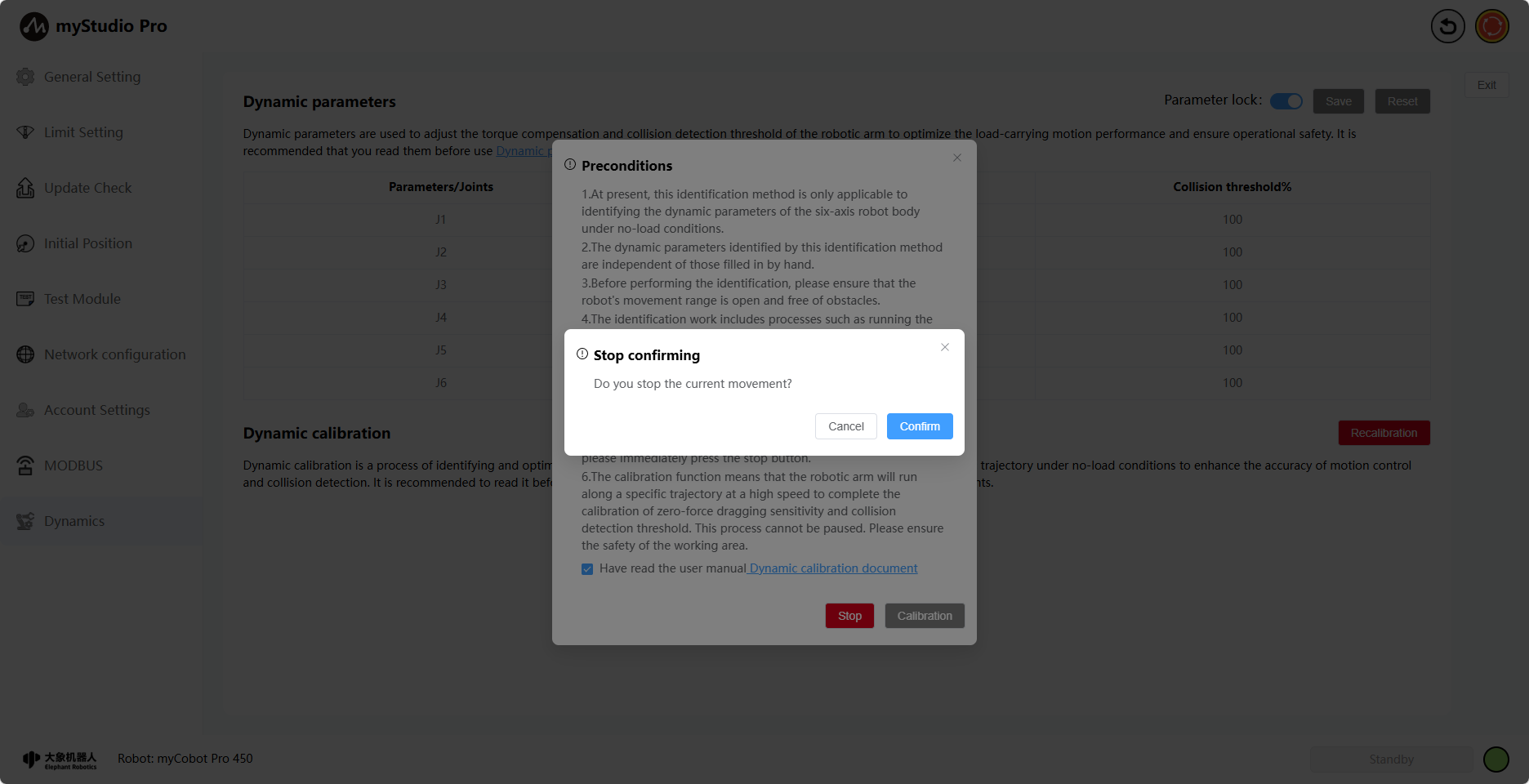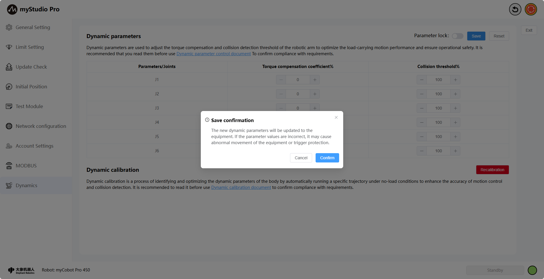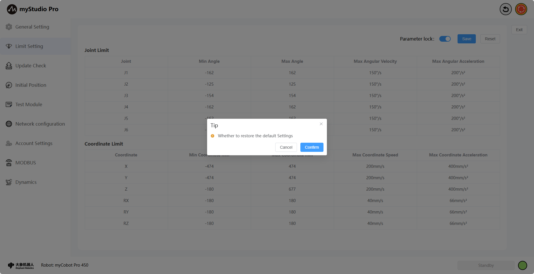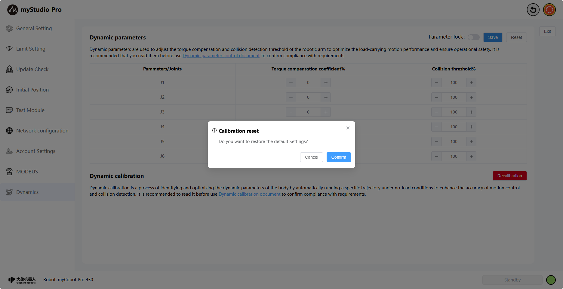 Click the Reset button to restore all torque compensation coefficients and collision thresholds to their default settings. A prompt will appear asking if you want to restore the default settings.