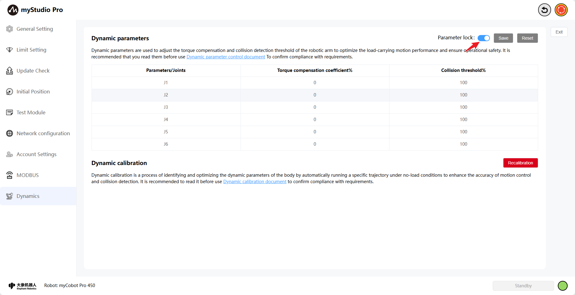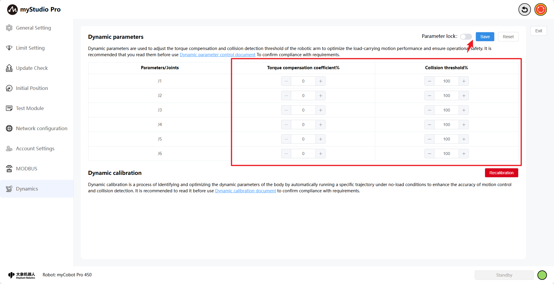 Torque Compensation Coefficient Default Value 0% (0-50%): Sets the friction compensation system of the torque loop. A larger coefficient makes it easier to drag. The default collision threshold is 100% (range 50-250%). This sets the collision threshold for the joints; a smaller value makes collisions more likely.
