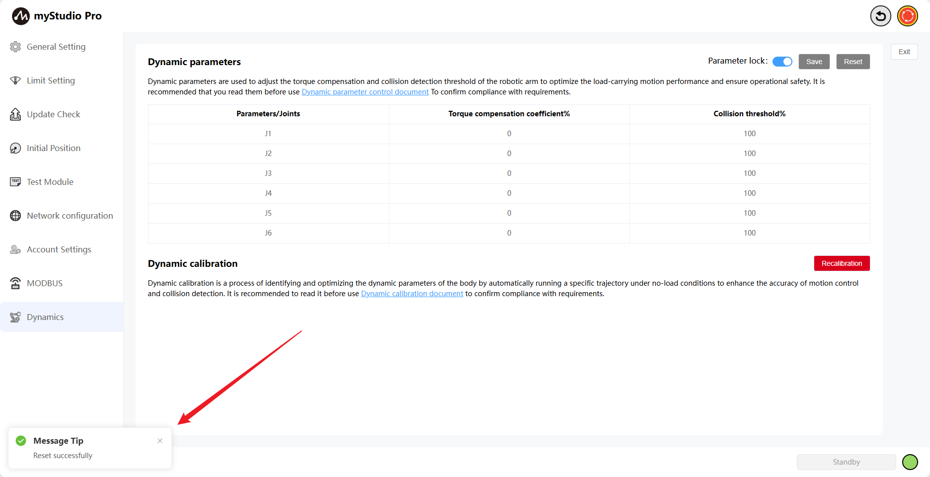 Clicking the Save button will save the modified torque compensation coefficient and collision threshold. A message will appear on the page upon successful setting, and the parameters will be automatically locked.